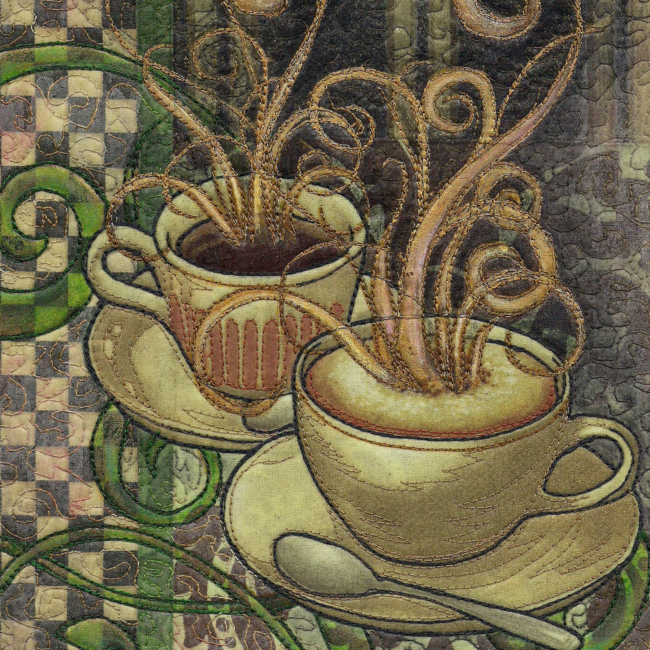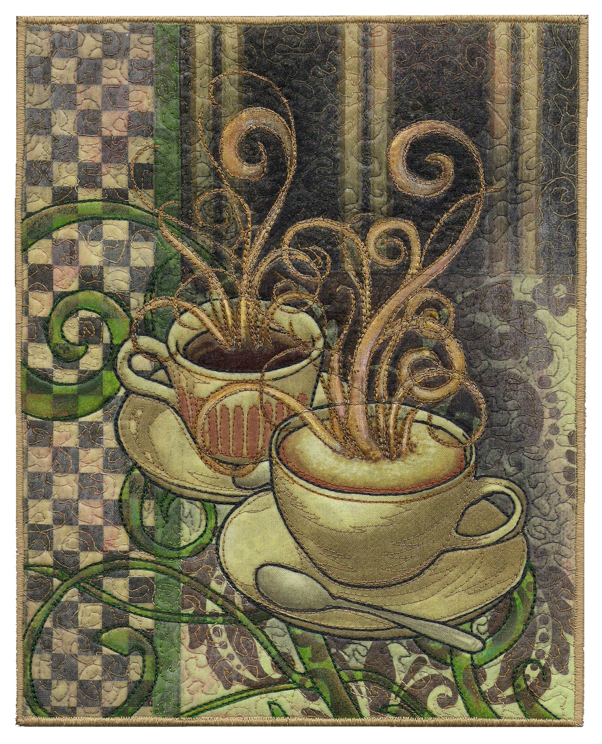 Pieced background, broderie perse applique, swirl design drawn on, free motion stitching, and painting