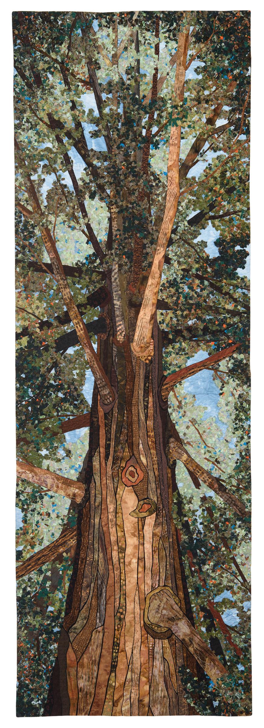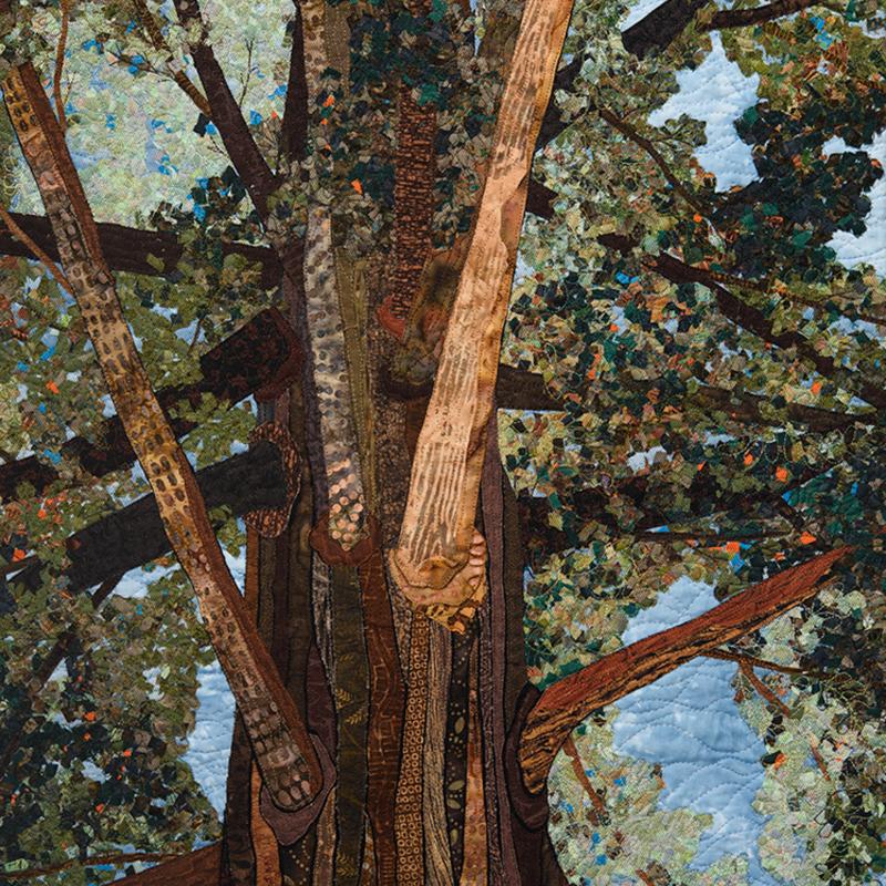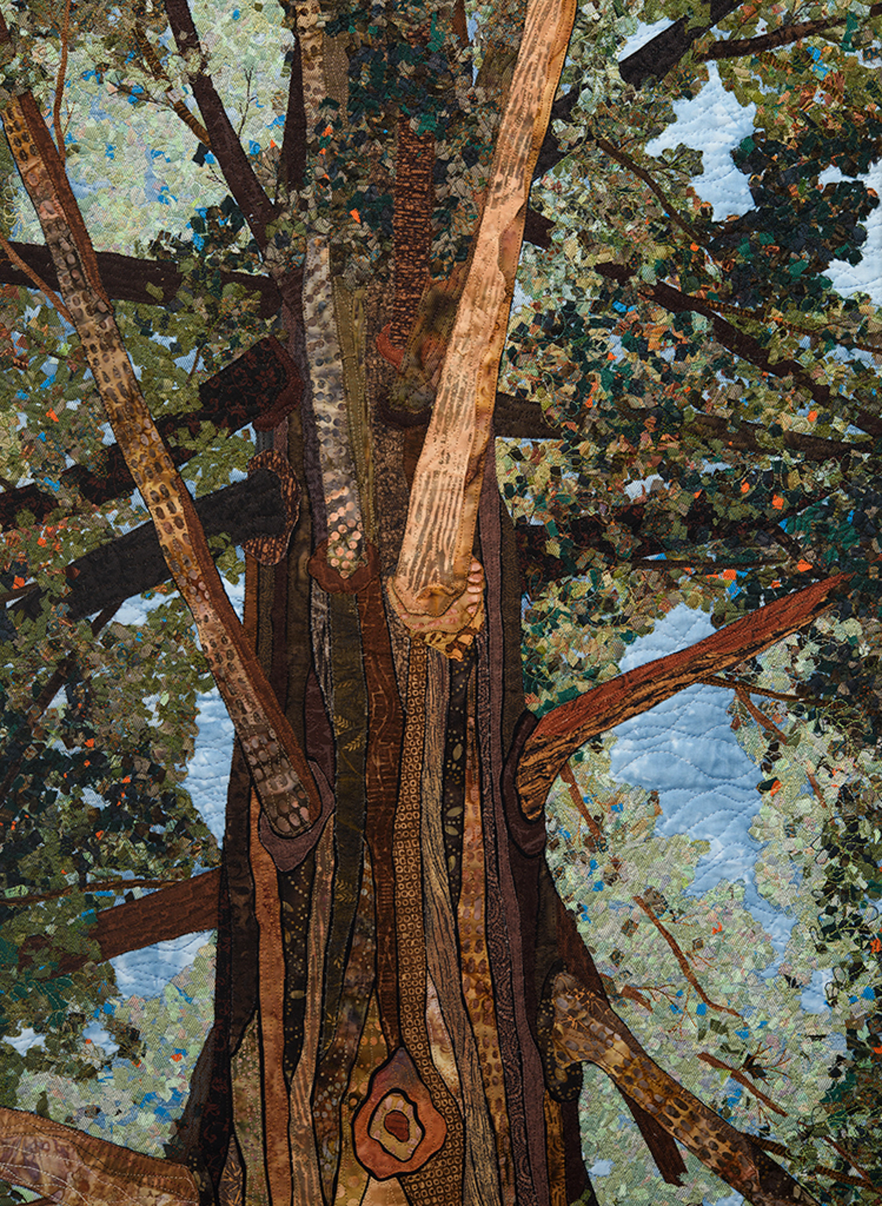 Impressionistic landscape technique, raw-edge appliqué, machine quilting, faced edges.
