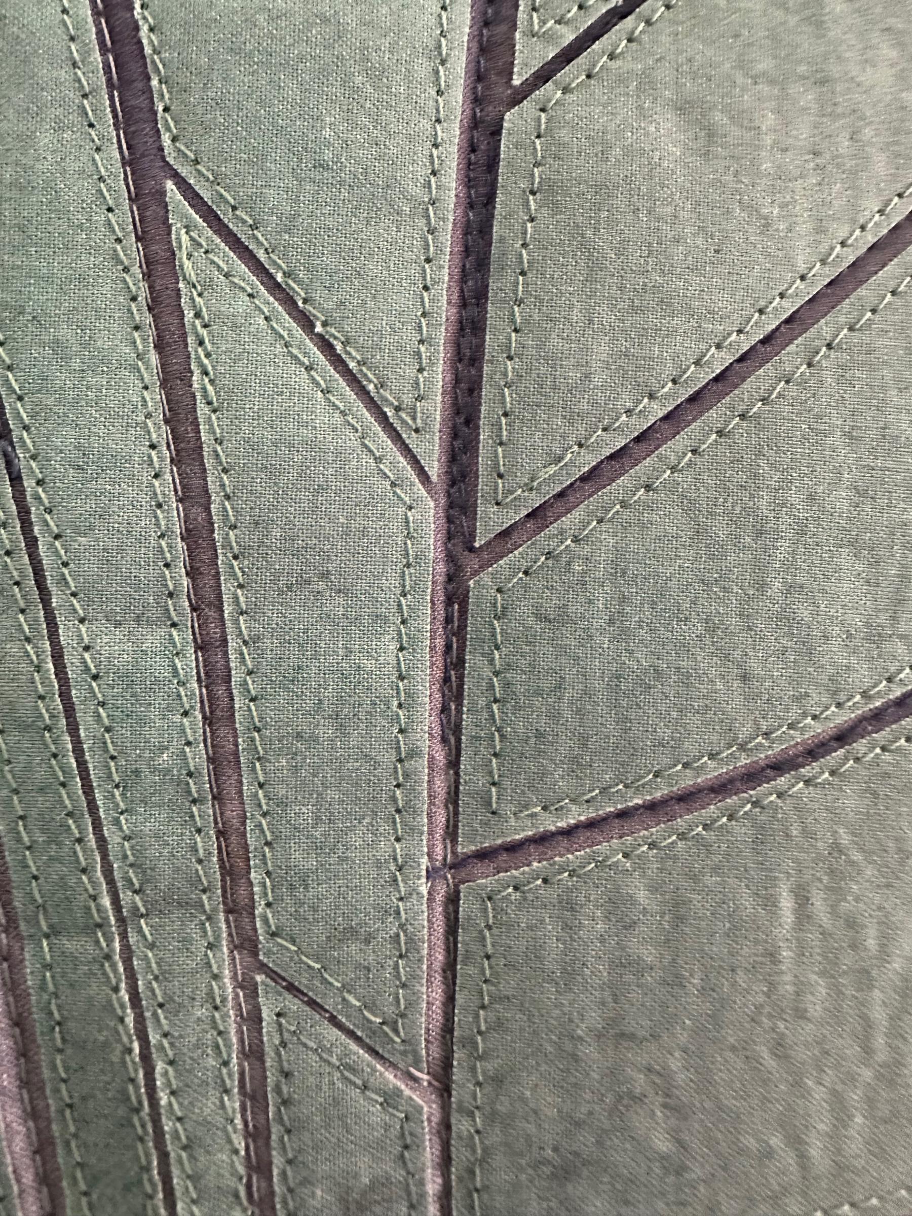 As the daughter and granddaughter of dressmakers, I began sewing at an early age. I was always excited about the possibility of a new project, a new range of color and texture choices. Within the last eight years I have found my voice making art quilts. My creative process starts most often with a color concept. From there, I choose my fabrics and see what happens. The inspiration for this quilt was my fascination with ombre fabric. I loved the idea of the two colorways traveling in opposite directions and the quilting continuing the design to the edge.