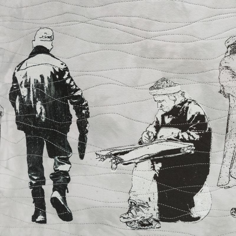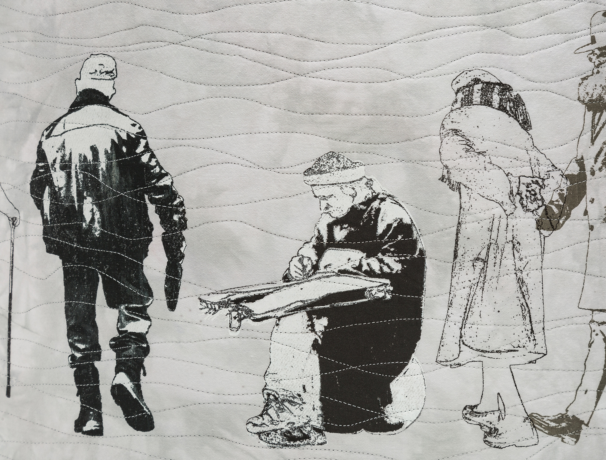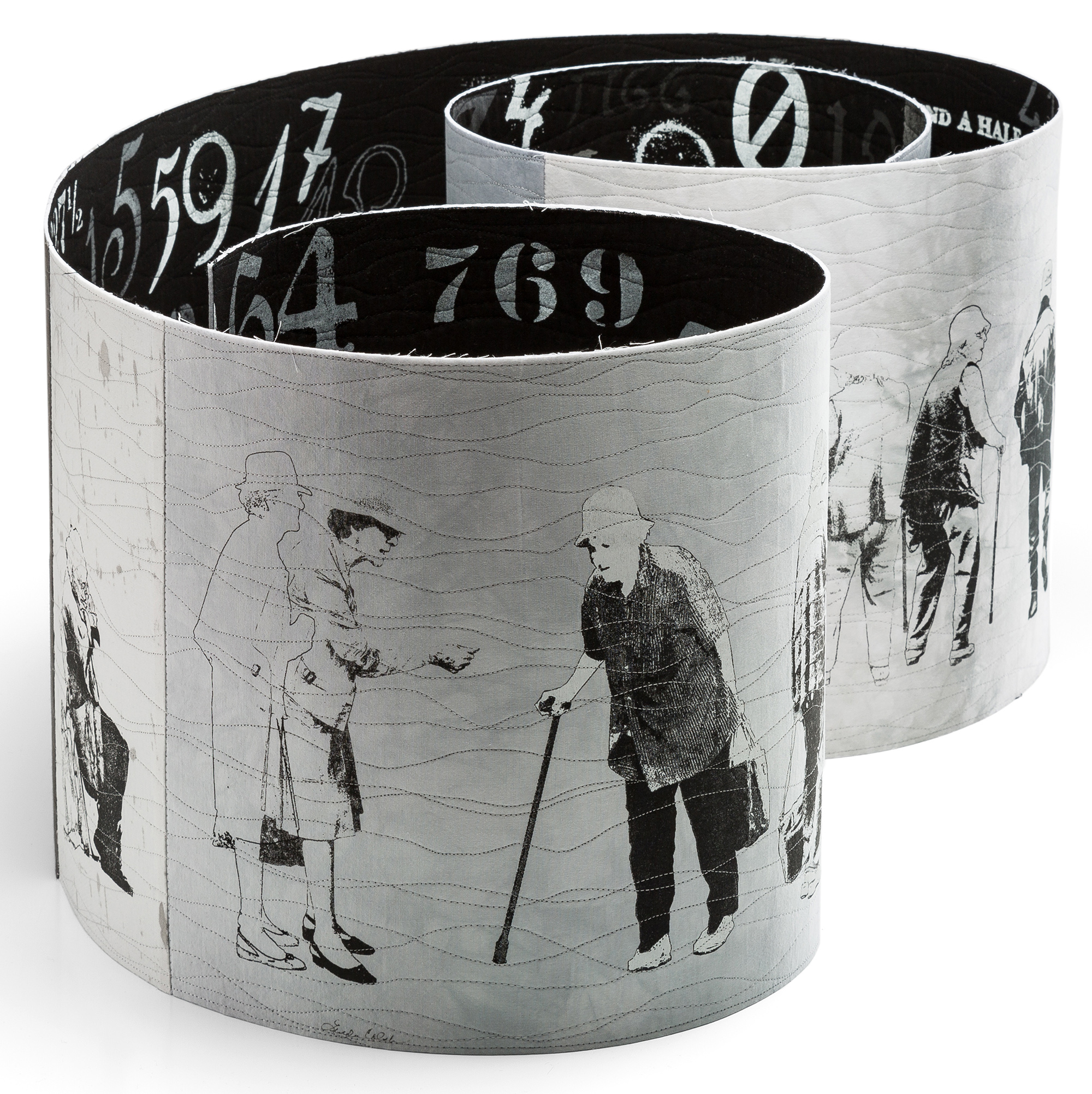 Screenprinted, inked & dyed by the artist with screens made from her digitally altered photographs; machine pieced, and machine quilted.