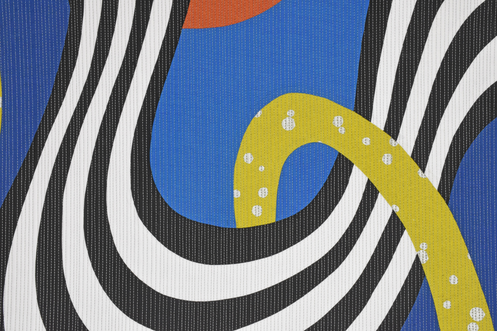 "In One Ear and Out the Other" is from my Communications series begun in 2020. The ovals represent individuals, while communication is represented by the black and white lines. This quilt explores the idea that much of what we hear goes “in one ear and out the other.” We are exposed to a plethora of words and pictures, but how much of that is actually connected to us? Does it make a difference in our lives?
