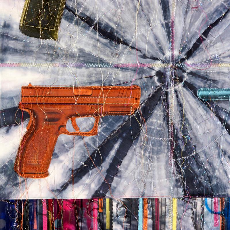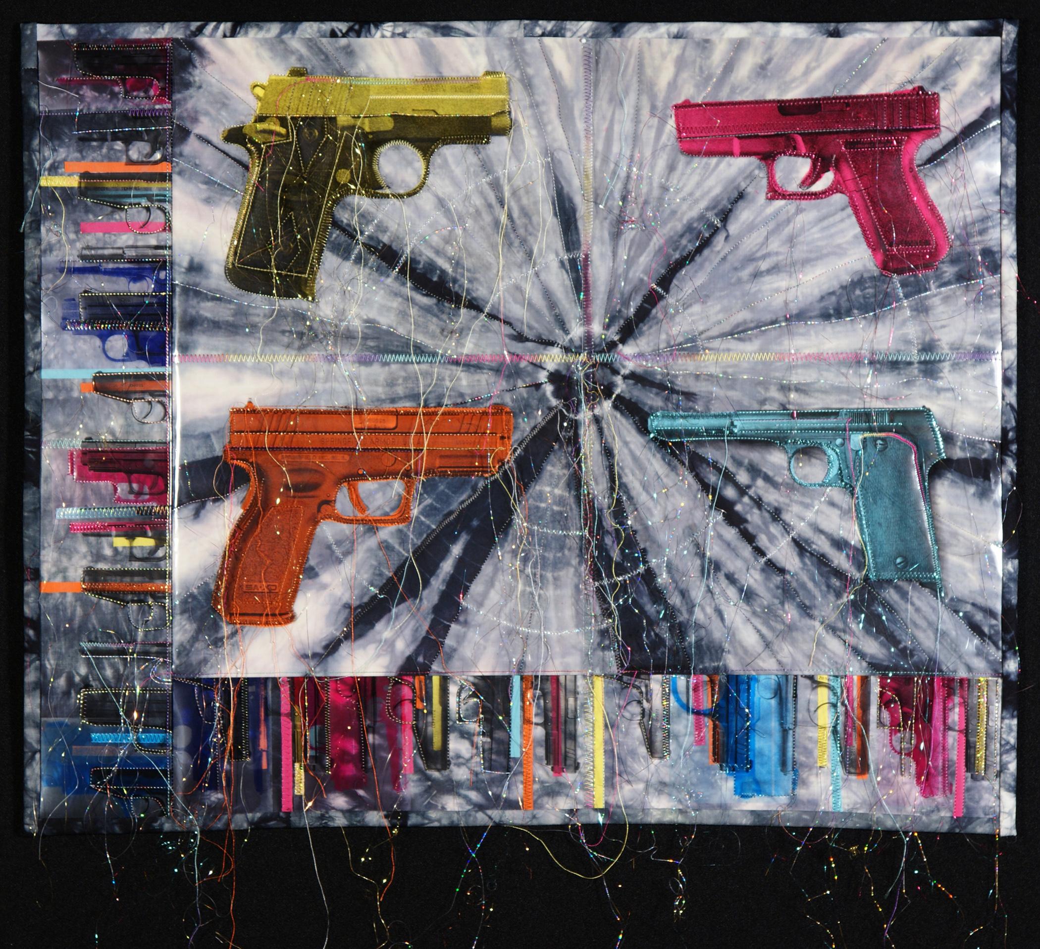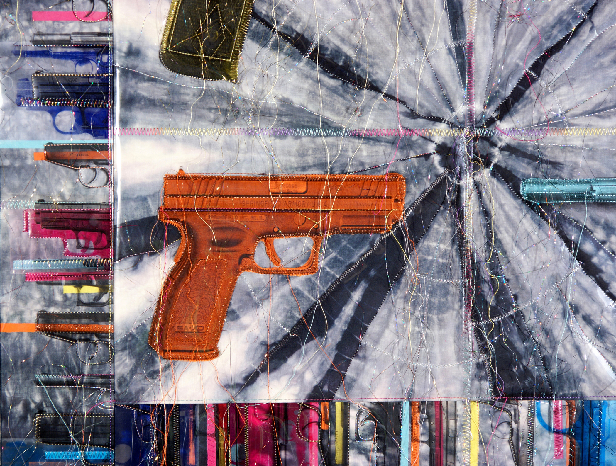 The proliferation of hand guns across the United States is a hotly debated issue, dividing states, neighborhoods and families. The solution does not appear clear, as countless victims fall to unchecked gun violence. Demonstrations and rallies regularly fill the streets with protestors carrying banners and signs. Gun related graffiti covers walls, bridges and highways across the country, in both cities and small towns. This piece is my contribution to this ongoing, and ever growing protest.