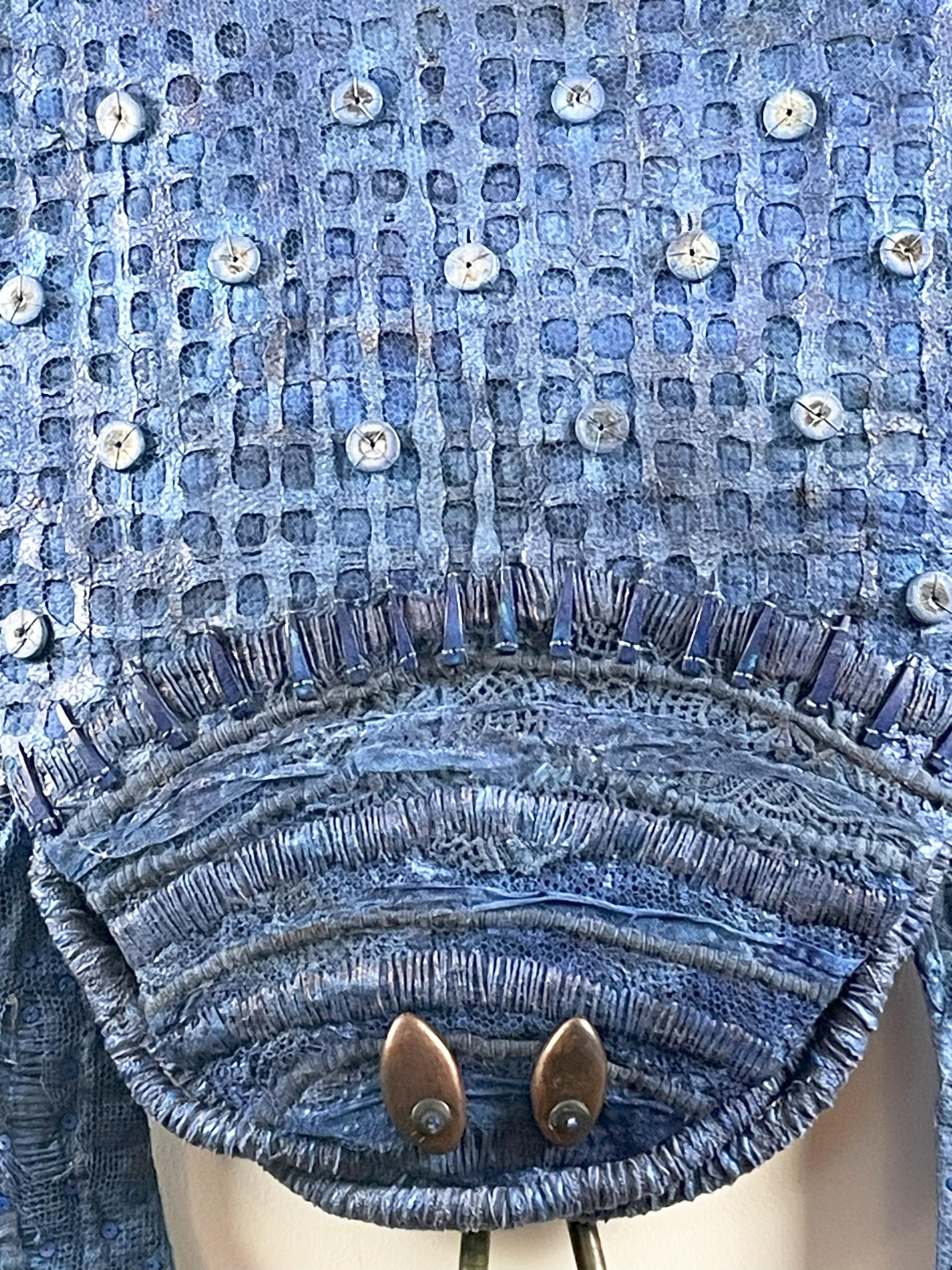 Cotton, tulle, netting, handmade papers, wrapped coils, yarn, wood and shell beads, felt, paint, ink, vintage wood spools