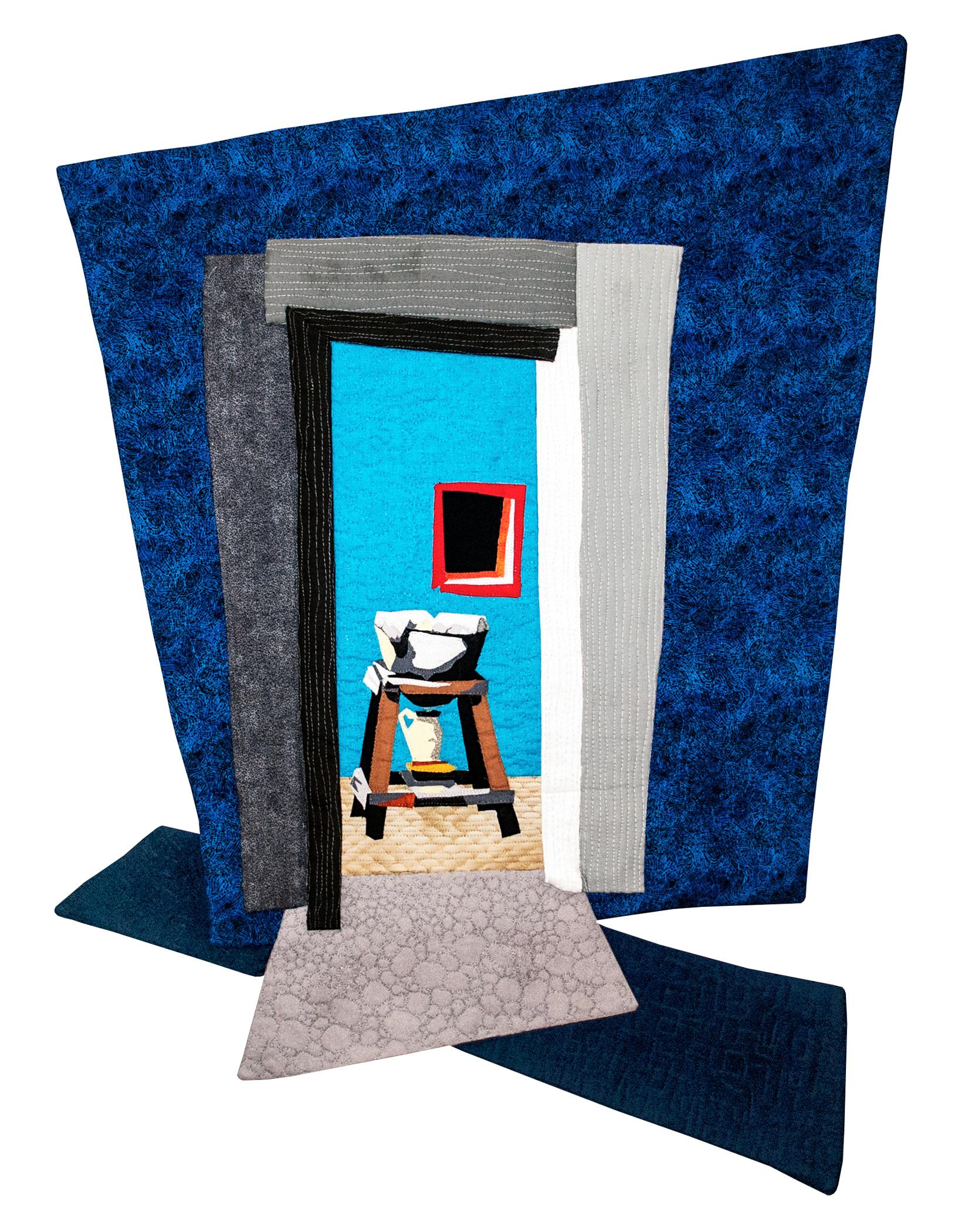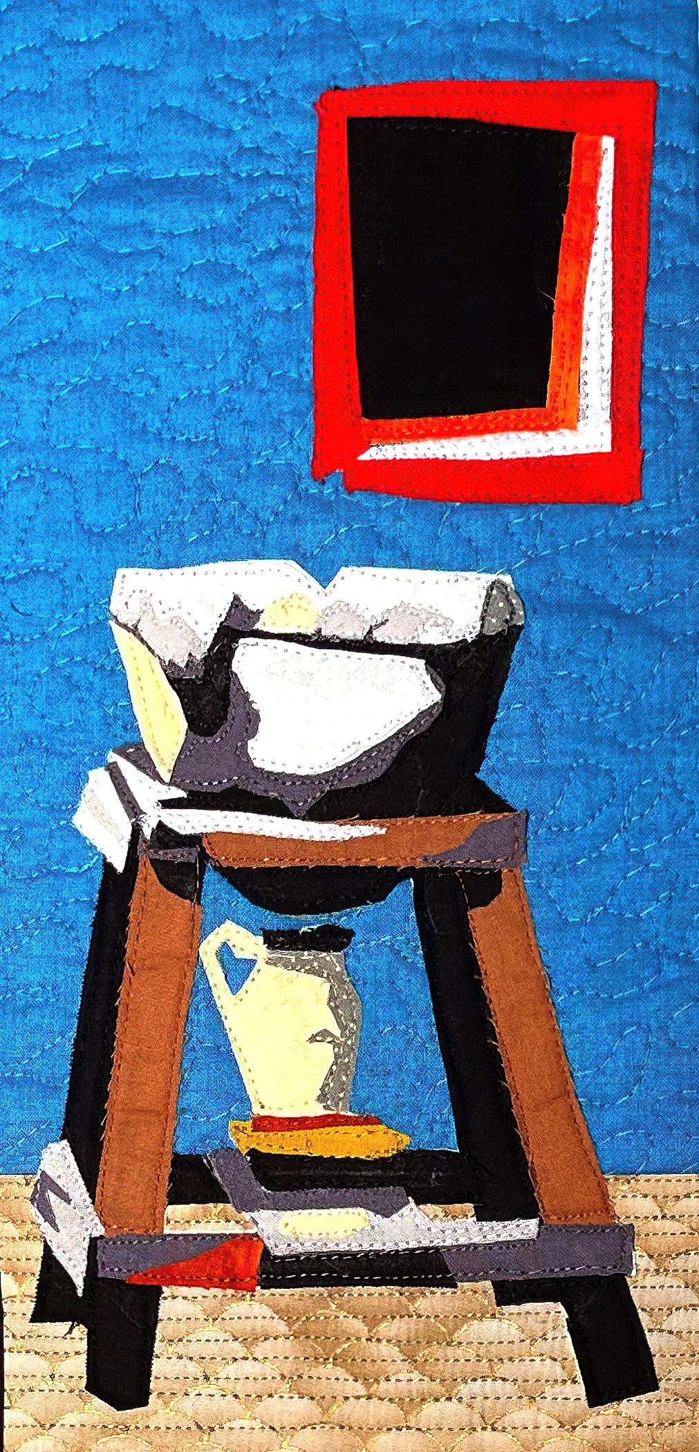 Inspiration came from a hotel in Peru, where I was drawn to a stucco exterior wall. It was painted a brilliant ultramarine, inviting me into an interior courtyard that was an equally vibrant aqua blue. The bright red open window was an enticement to explore more yet unknown spaces, while the rainwater-collecting vessel offered a safe embracing pause.