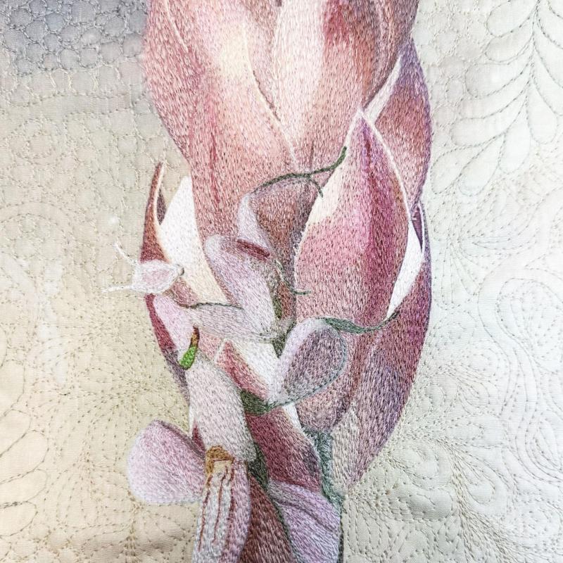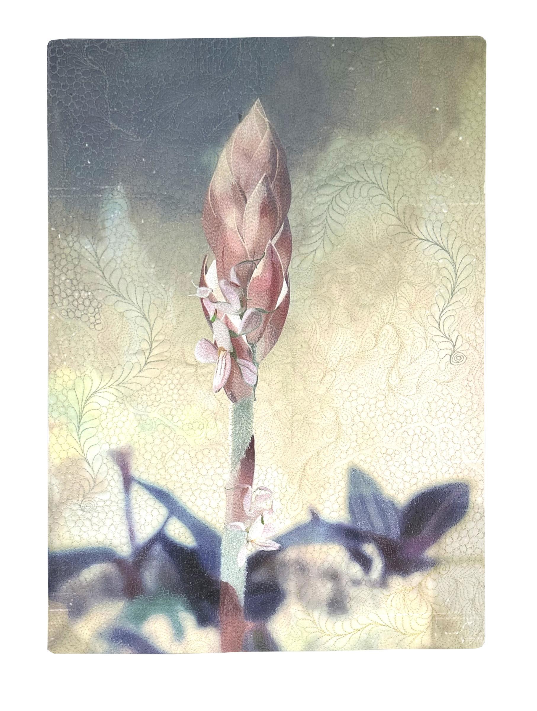 This artwork combines two orchid praying mantises and the stalk of a yucca plant. The praying mantis is a master of camouflage. Its leg lobes are pink, rose, and white, easily camouflaged on the yucca plant. It can turn into a different color within two days if the plant has a deeper color. The mantis will easily blend into the plant it rests on while waiting for prey.