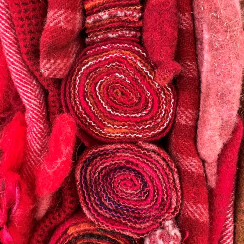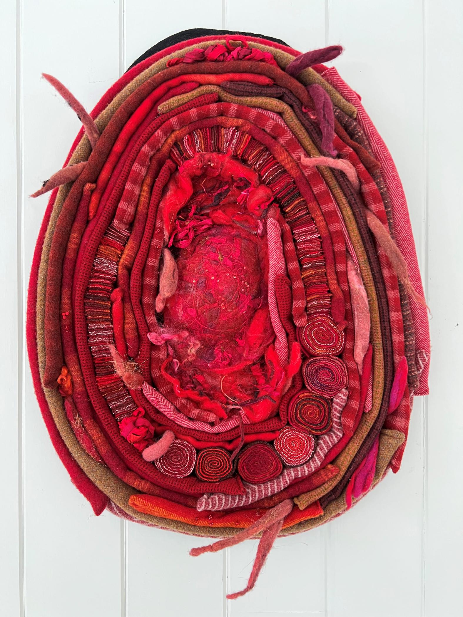 Wet felted, free motion embroidered, rolled wool quillies, stacked, folded, stuffed, hand stitched, hand beaded