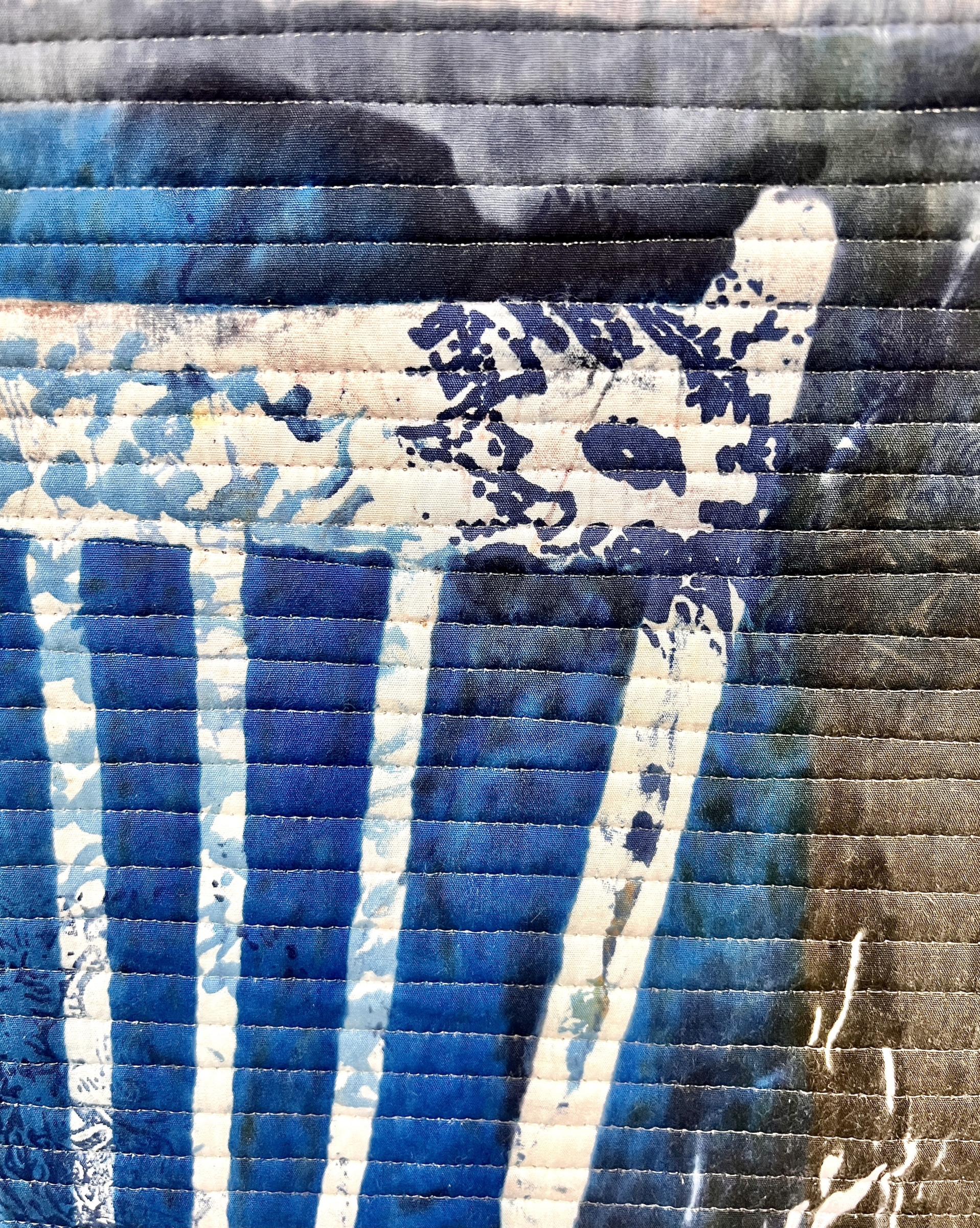 deconstructed screen printing, stamping, stencilling, painting, machine piecing, long arm quilted