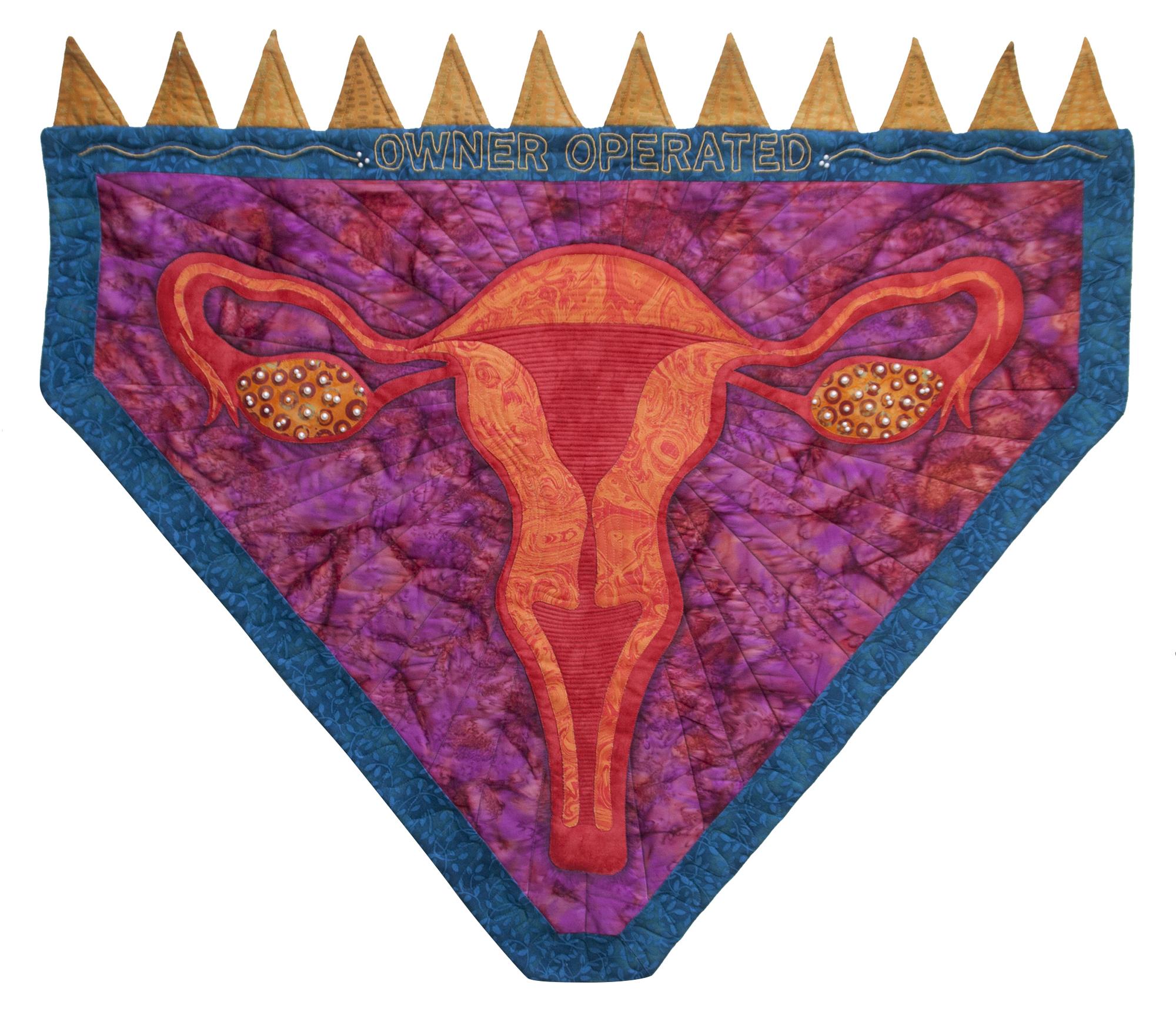In support of women who continue the fight for equal standing in our society, my quilt symbolizes the power women have to control their own bodies. The shape of the quilt is that of a superhero badge. It features a bejeweled uterus. And, to drive the point home it says “Owner Operated”.