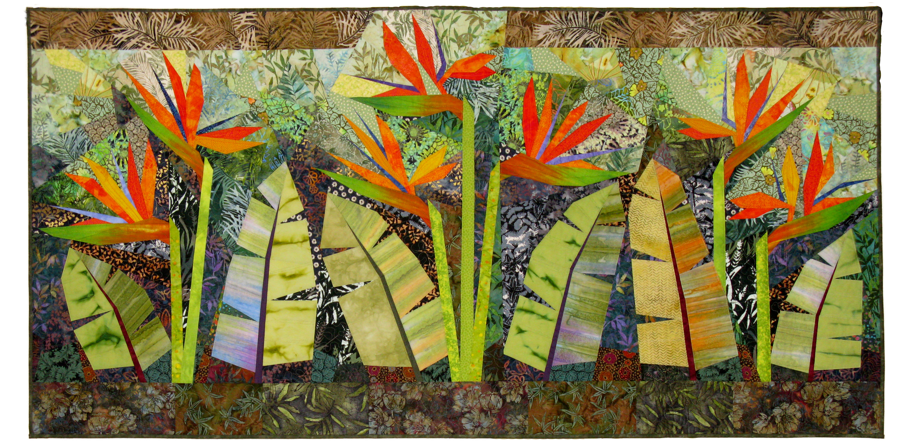 Paradise Garden was a commission work. My client specified the subject matter (Bird of Paradise flowers) and size of the quilt (3 feet by 6 feet) and left the rest to me.� Inspired by the vividly colored Bird of Paradise flower, this art quilt is constructed from batiks and commercial cotton fabrics. Machine pieced and quilted from my original design, the quilt highlights the radiant orange and vibrant violet-blue petals against the dark, lush colors of the jungle forest.