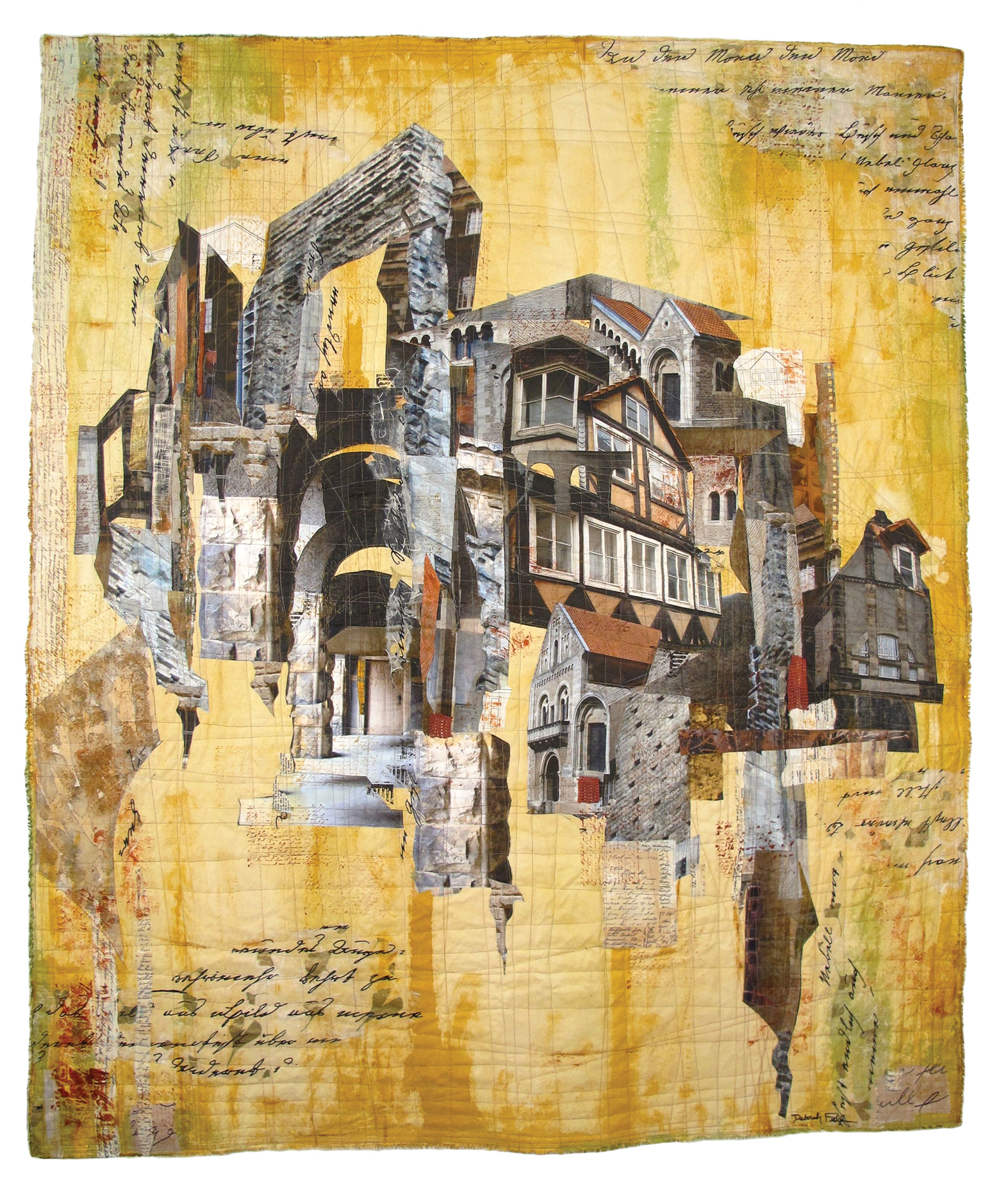 Architecture is a conversation between the past and the future. The fractured building images used in this series are from Germany. The dialog of design starts with the camera and expands with the use of cloth, thread and digital photo transfers. Fragmented architectural elements and use of line and scale create depth and ambiguity. The graphic and realistic elements deepen the obscurity even greater.