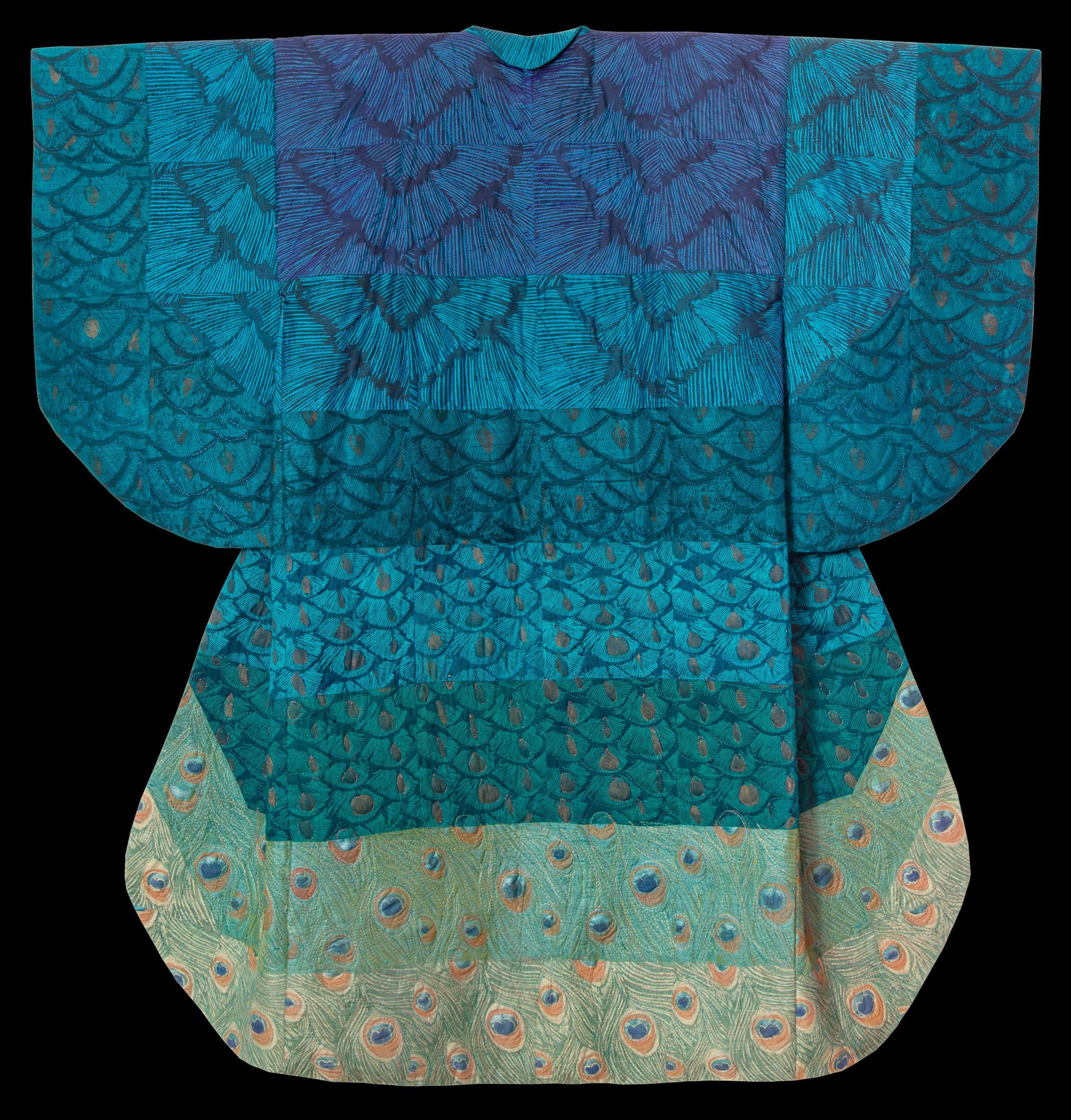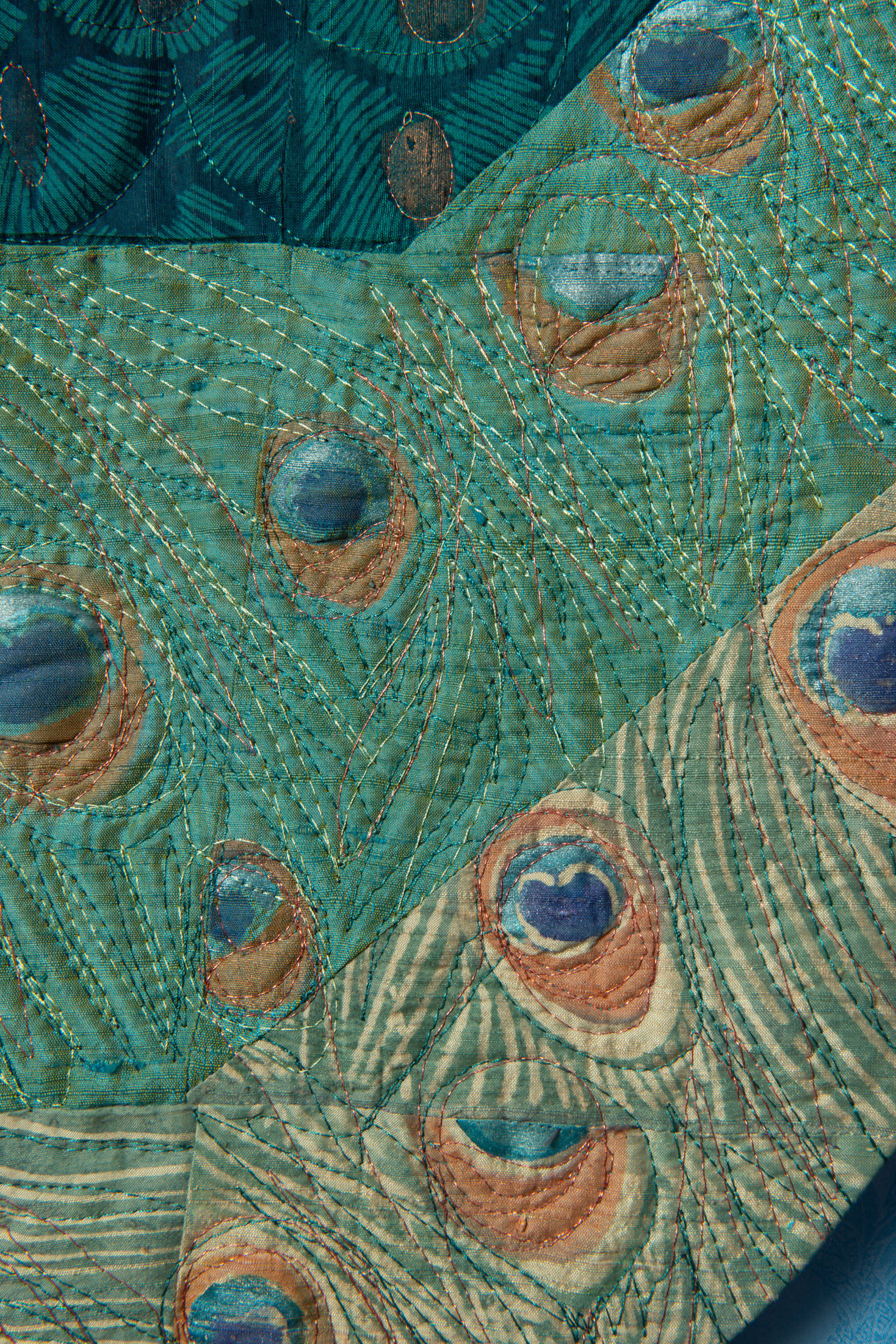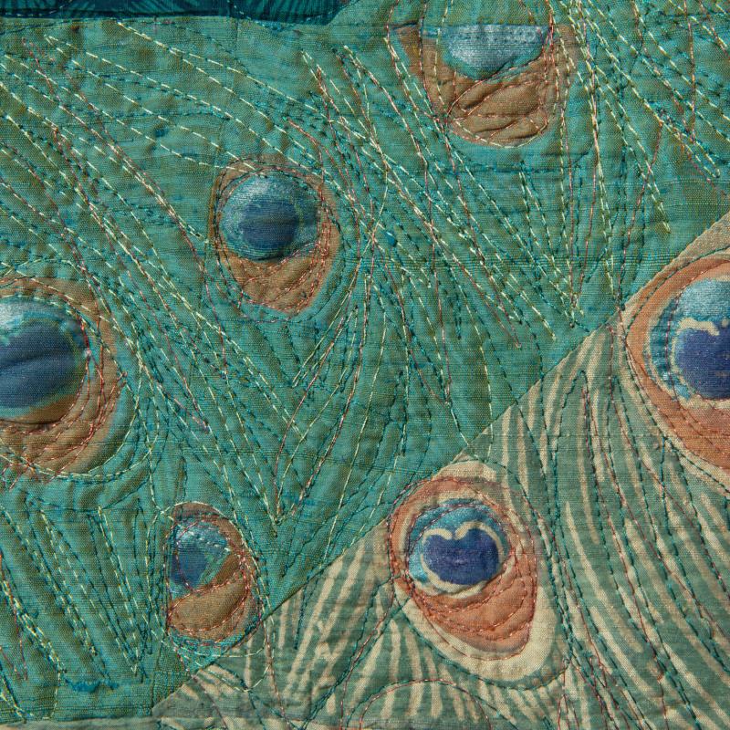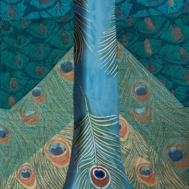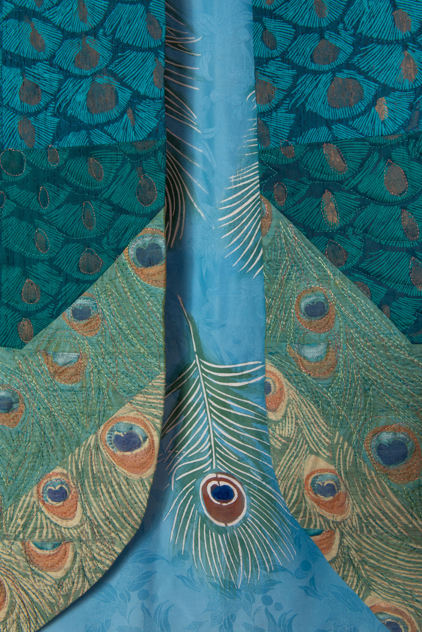 Who would think that a male peacock with its gaudy colors could ever be camouflaged? I was astonished to learn that recent research suggests all known peacock predators see only in black and white, so the subtle patterns of their beautiful feathers could actually be an effective camouflage in the leafy jungle where peacocks live. I very much enjoyed designing stencils to capture the change in pattern from head to tip of tail.