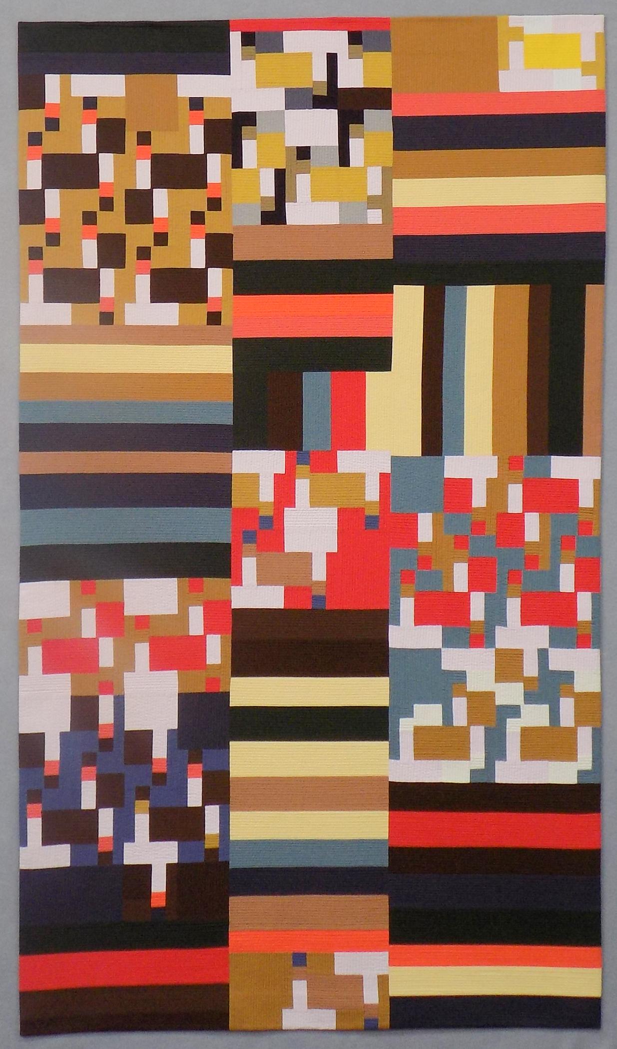 Hudson's Bay and Pendleton. Tribal barter items. Broken promises. Continued production of historic blankets that use colors and designs from various native tribes. Pendleton is the first in a series that organizes a small unit unto a structure I refer to as grids. This iteration leans on scrap fabrics and relies on planned and random chance to inform design decisions.