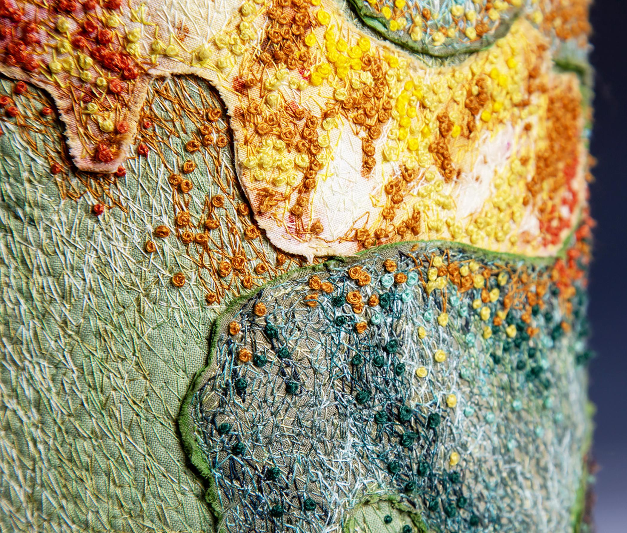 Trees have turned into a source of never-ending fascination and inspiration. This new series of vessels endeavors to explore the textures, colors, and lines in the bark of trees from around the world. Bark is considered an accumulation of several different outer layers of a wood plant. Similarly, multiple layers are what I use to create my vessels, either by machine or hand stitching, or a combination of both. I am forced to take my time and truly study what nature has so masterfully created as I attempt to emulate its beauty while interpreting these forms in stitch.