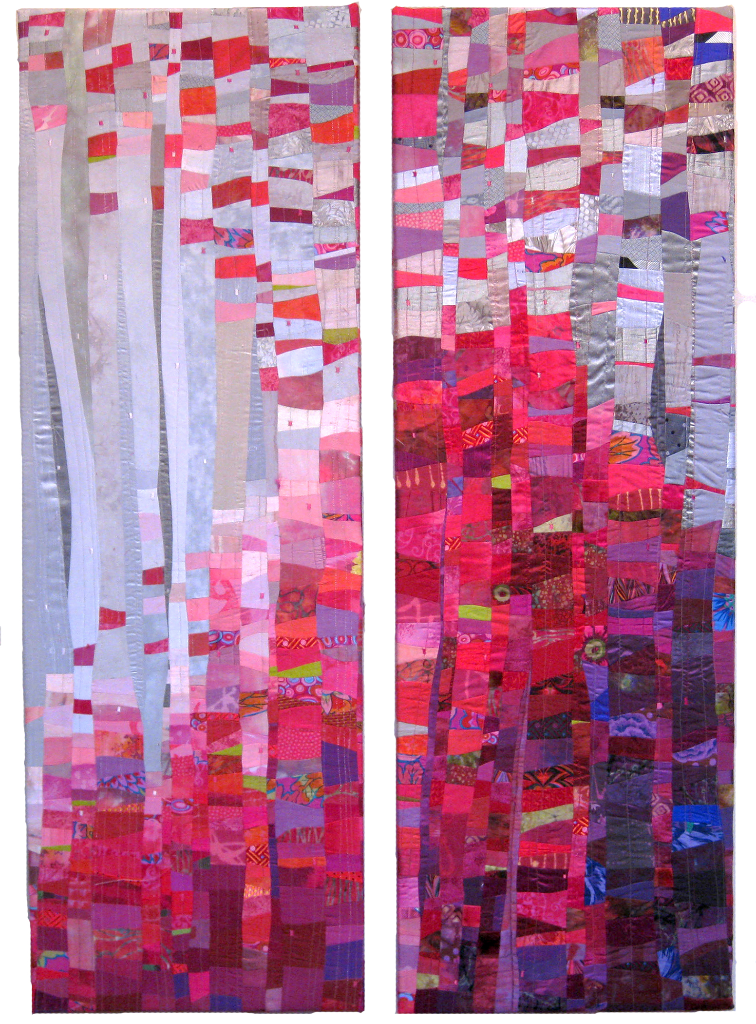 This was my first piece that I stretched over a frame. It is a dyptich. I have been doing art quilts for 10 years and my work has changed dramatically as I have tried every technique that interested me until I settled on abstract piecing. Then in 2014 I became in fabric manipulation and 3-dimensional work. Who knows what's next.