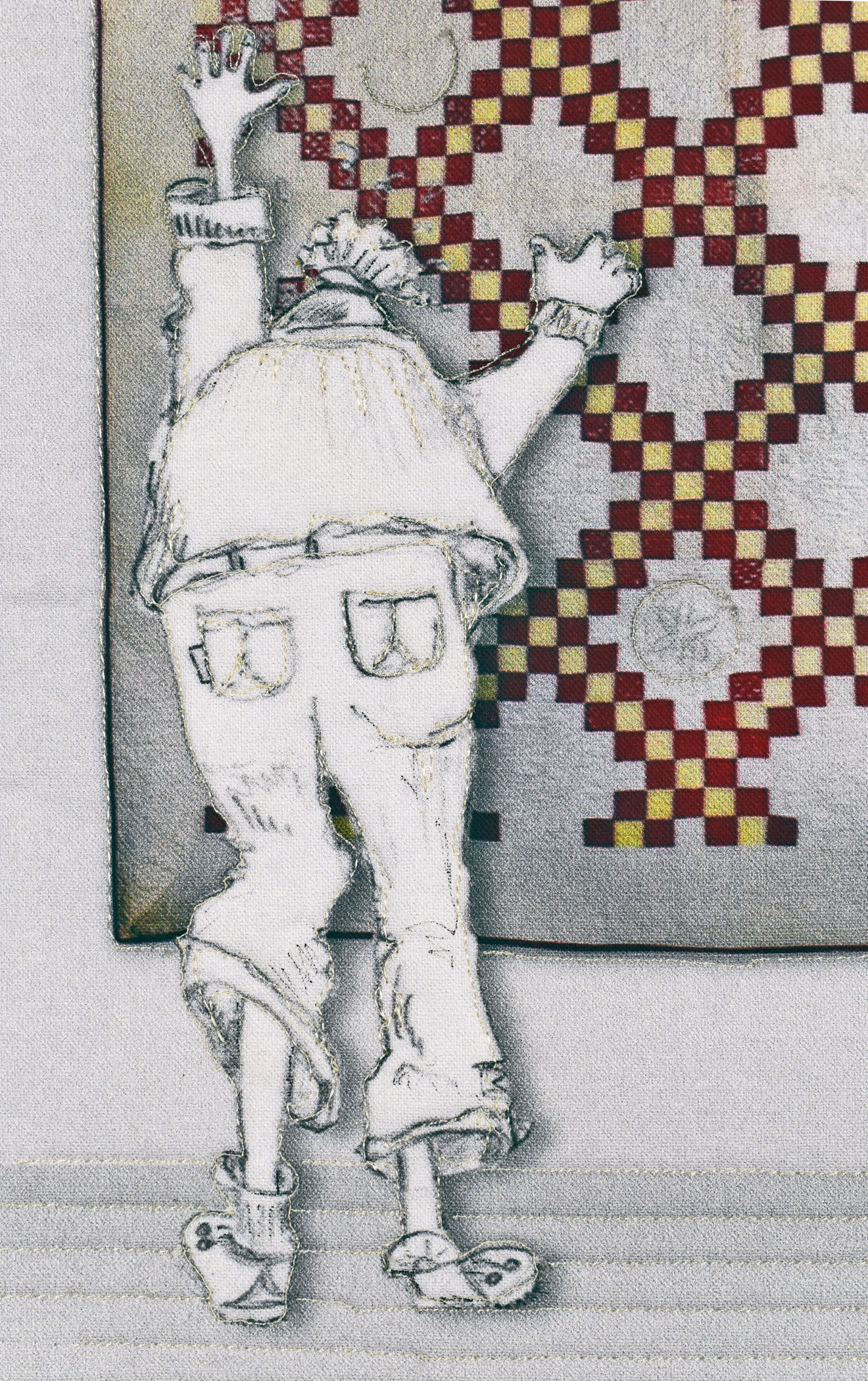 My cartoon drawing of "The Photo-Shoot Challenge" brings out anxieties that surface while trying to photograph one's art quilts. My cartoon depicts the ongoing frustrations with the crooked quilt, the uneven sides, bad lighting, and hanging quilts yourself for the photo. I see many in the same situation. Photo challenges for a vintage quilt can be exasperating due to the age of the quilt, flaws, and damage, but my funny resolve can be a keepsake photo of a precious family heirloom quilt.