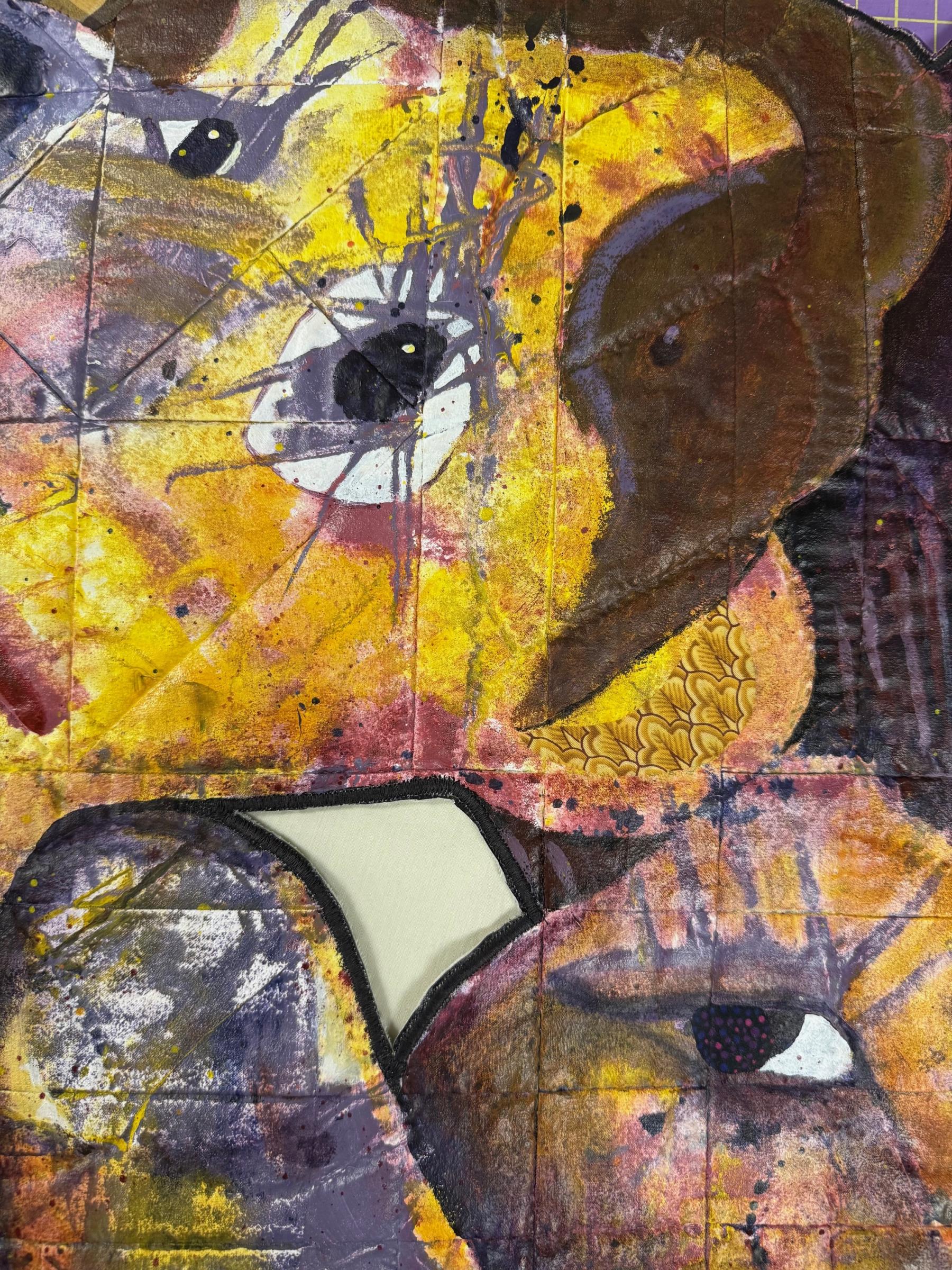gessoed quilt panel, acrylic paint, posca markers, fabrics, matte medium, thread