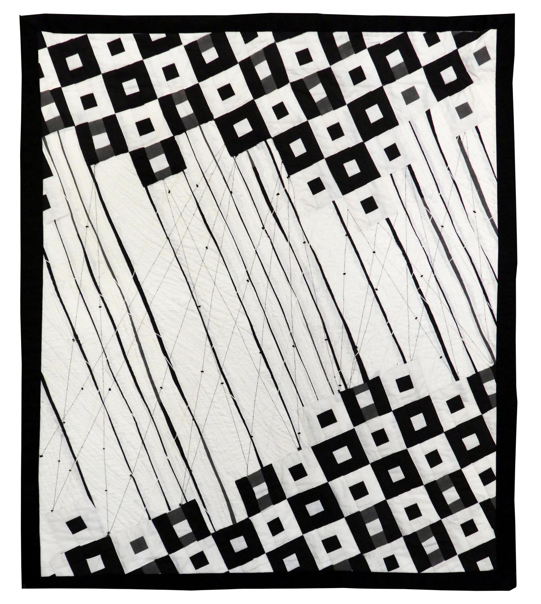 Music bounces back and forth to connect and recreate similar but different patterns. Patchwork squares are flanked by streams of quilted lines. A floating, gunmetalÂgrey string skips across the top and is pinned down with a small cluster of beads. The sewn lines depict a motion, rhythm, and tempo between the piano keys.