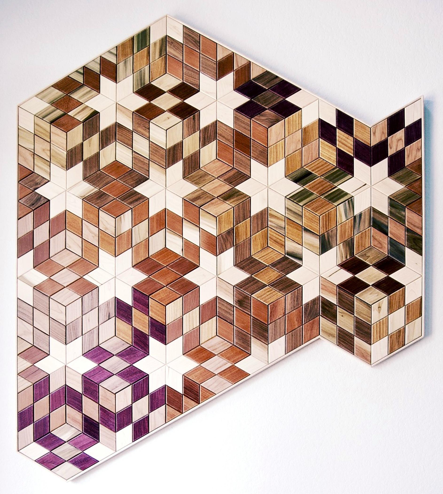 With 'Pieced', I had the opportunity to showcase the bountiful qualities of natural woods in all their many hues and unique characteristics. Nine wood types are presented in their natural state; no color additives were used. 'Pieced' is organized in a repeating 9-block diamond pattern on thin plywood substrates. Like a quilt, plywood is a sandwich of layers and stronger for it.