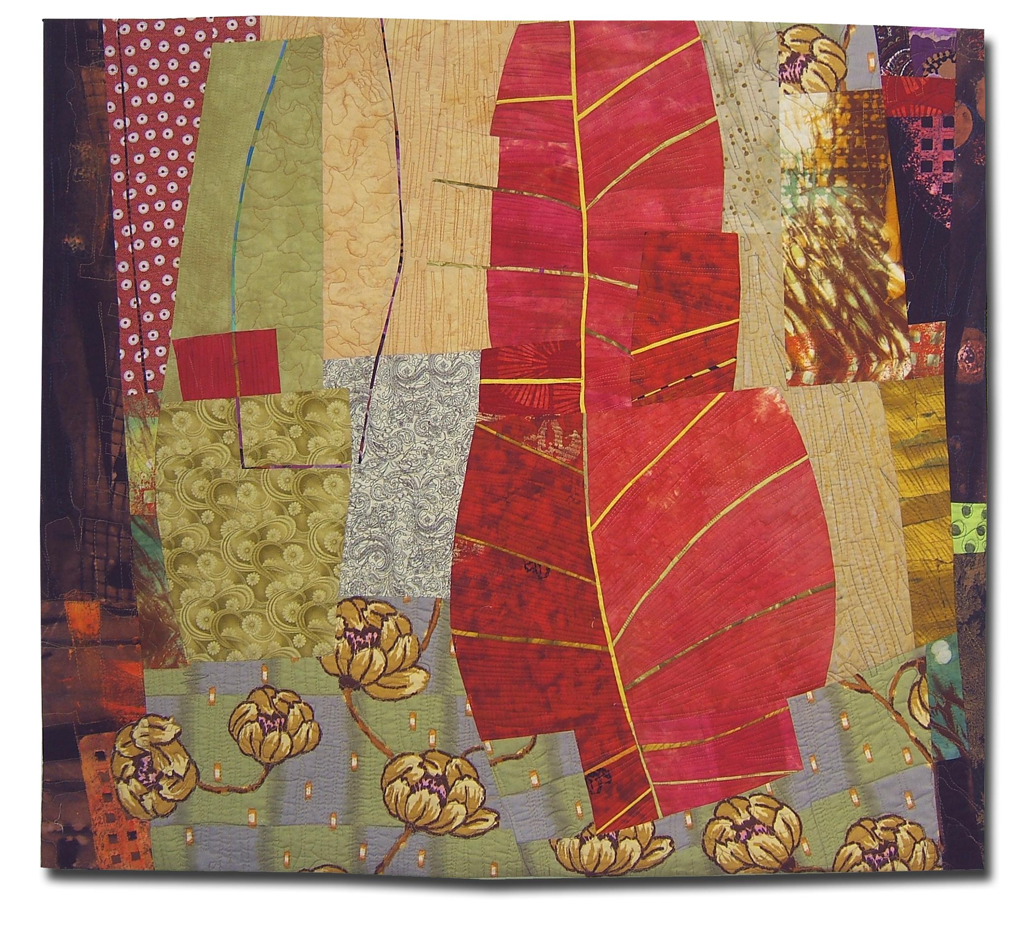 I was intrigued with using a thin line to delineate form, as well as detail. The image is derived from a mola that featured leaves accented with thin lines.