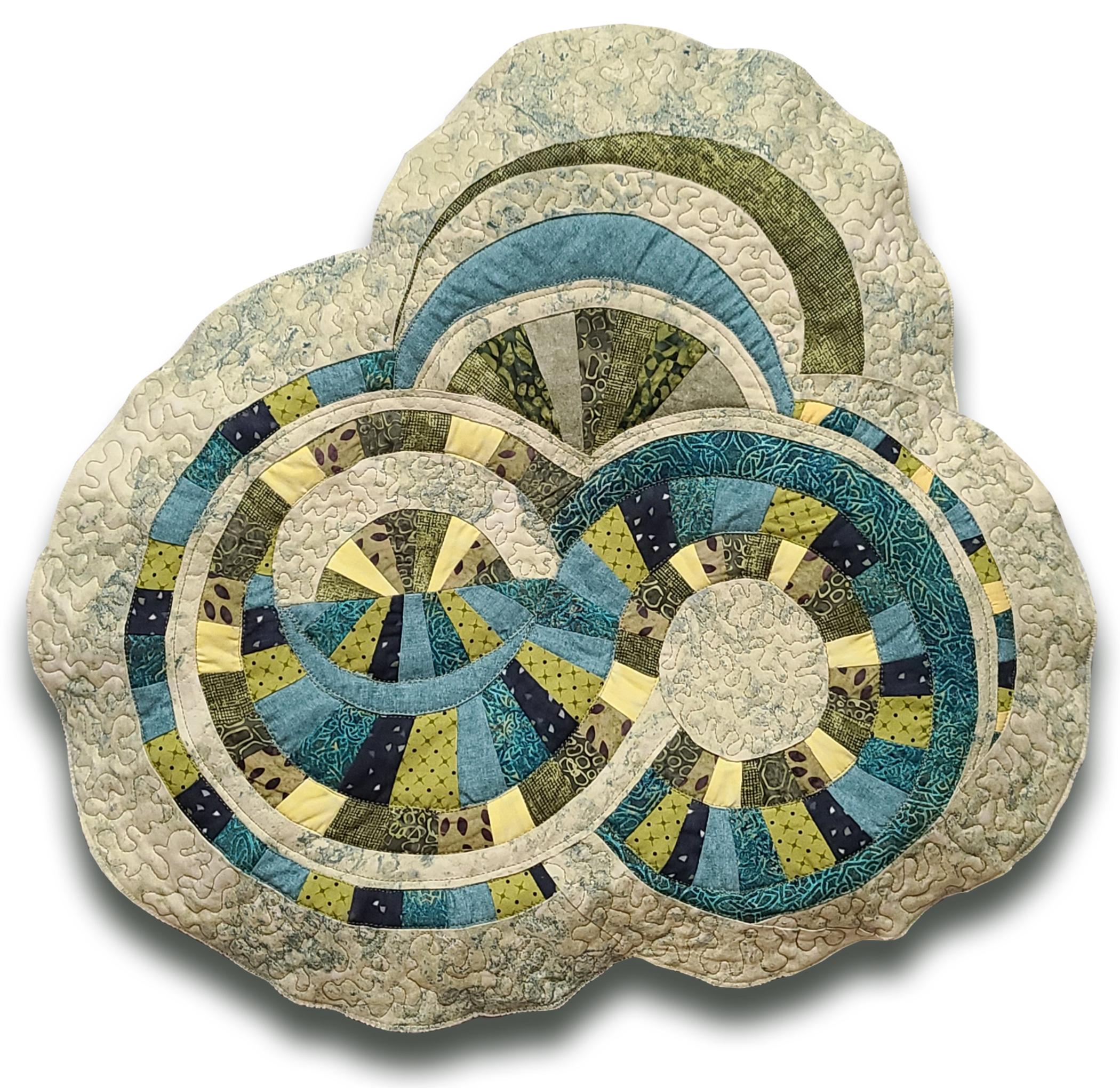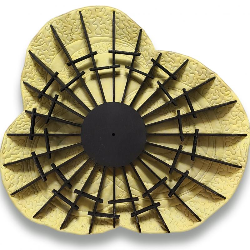 The structure begins with the quilt as the fabric joins to create a twirling design. The wooden support uses form and rib type structure, used in the construction of airplanes and model airplanes, to give it shape and make it appear to float off the wall.
