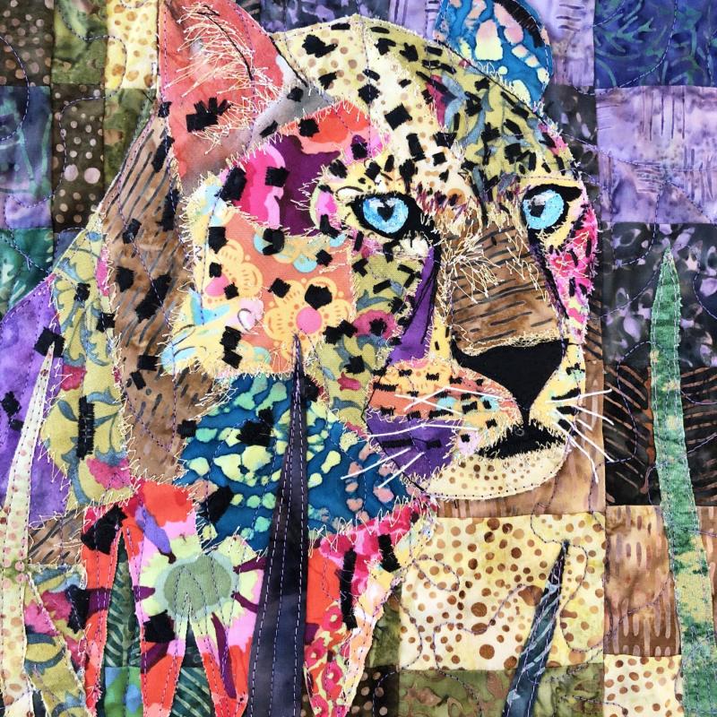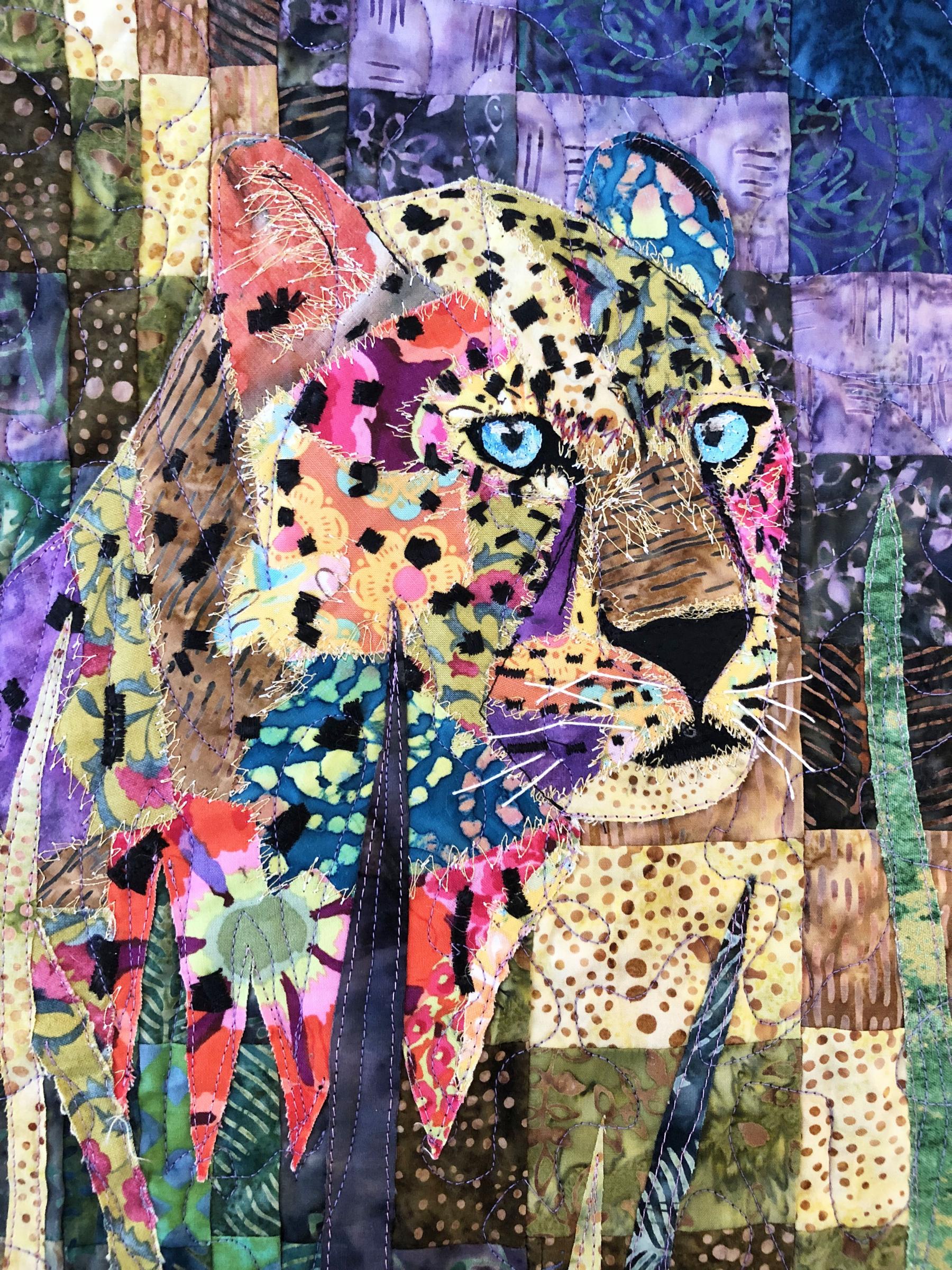 This began as a simple bargello quilt with my favorite batiks, but as I walked past it each day, I thought it still needed something. So I added a patchwork leopard hiding within the rows. And then some tall grass.