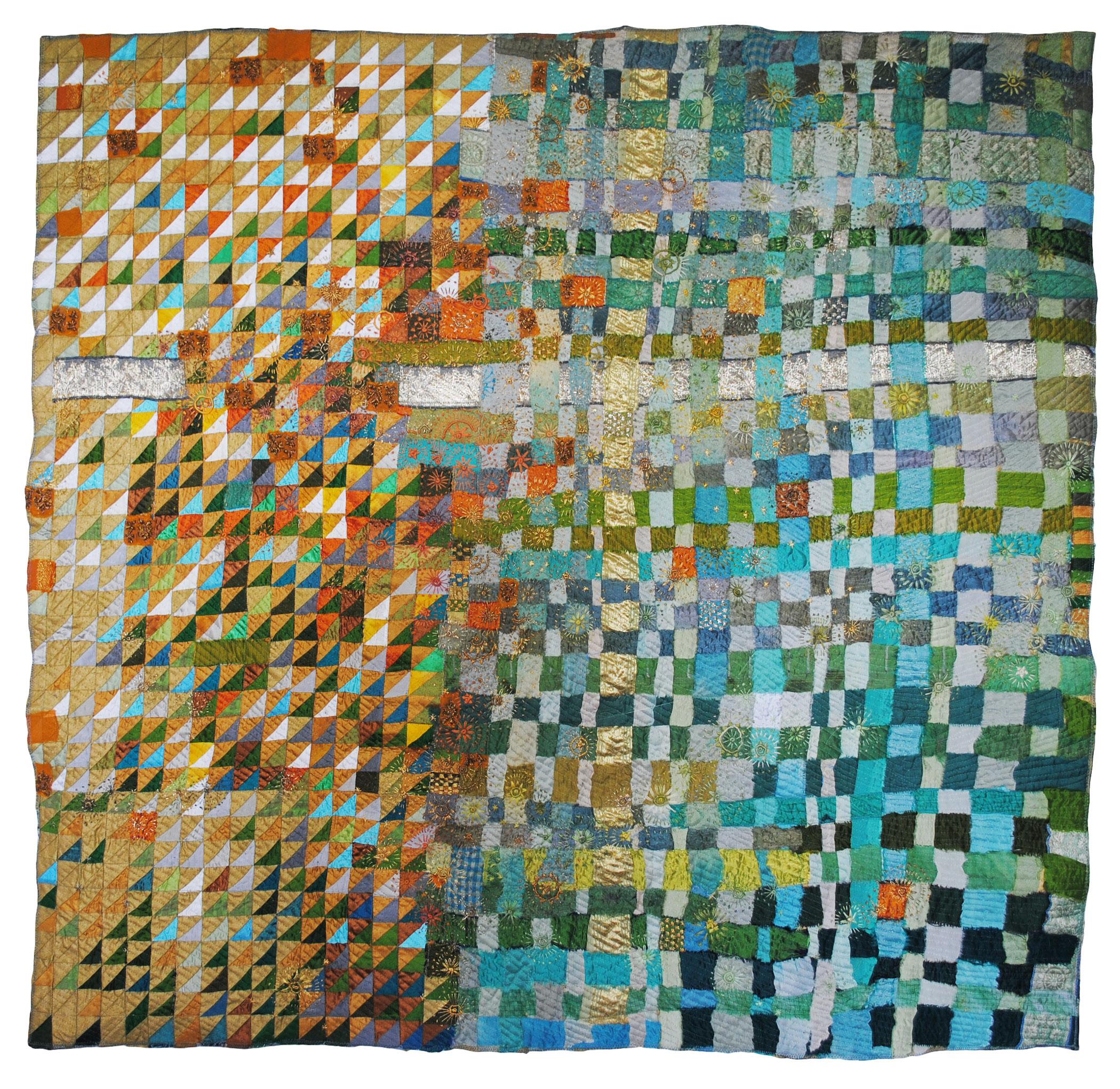 This piece was started before the pandemic was a reality. My thought was to show a rigid pattern morphing into a shadow of its former self. I added embroidery to embody the change that could be the impetus of the looser grid of frayed squares.