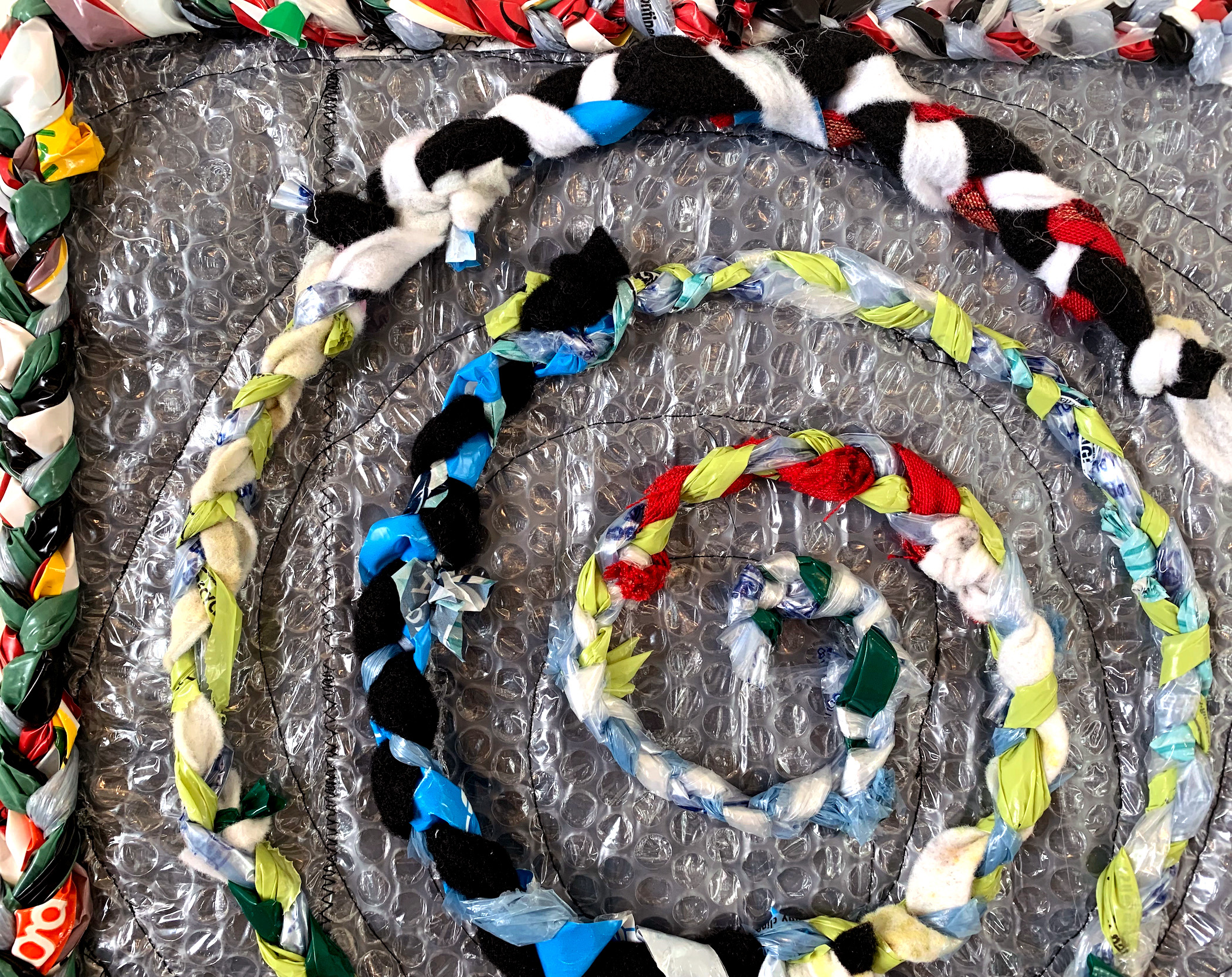 Plastic bags, fabric, plastic bubble wrap envelopes, detritus, cheese cloth, glue