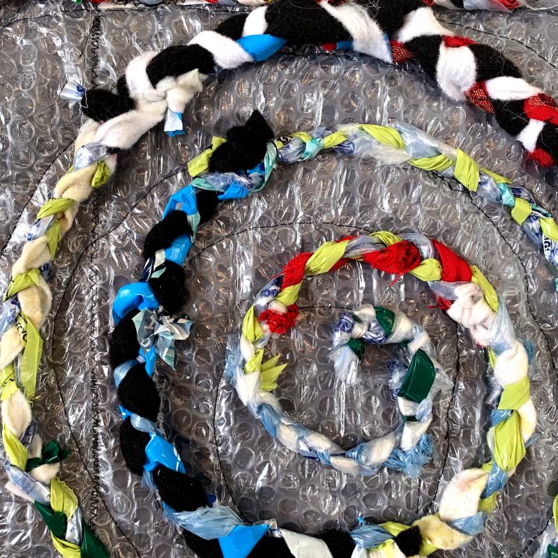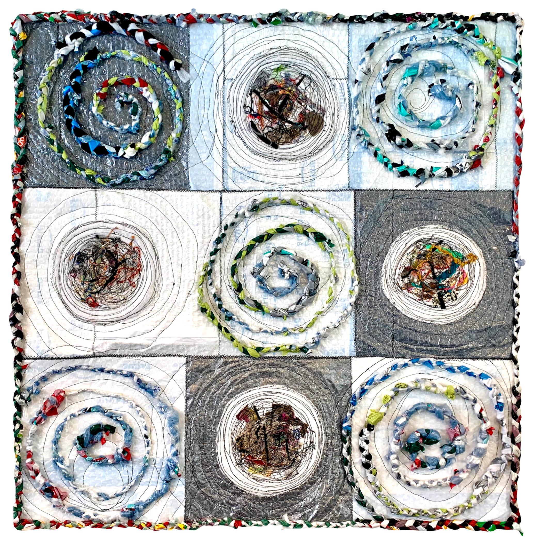 I am interested in using the quilt as a narrative to explore issues of significance in our world. Plasti-City uses a traditional nine patch quilt form to illustrate the world’s pandemic of plastic and textile waste. Plastic quilts have led to community conversations about plastic waste locally and globally. A team of artists collaborated with local activists to create an art show and three radio programs to inform our local citizenry about this world-wide problem and to help everyone understand possible solutions.