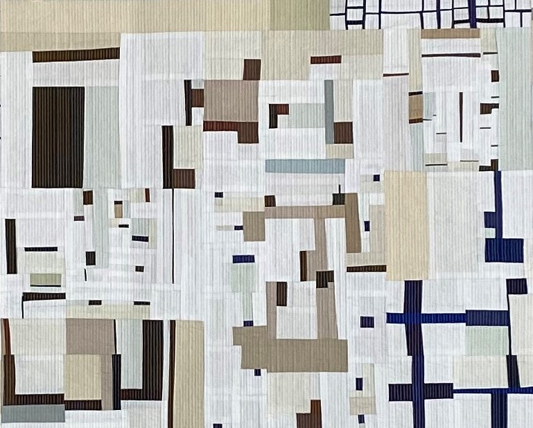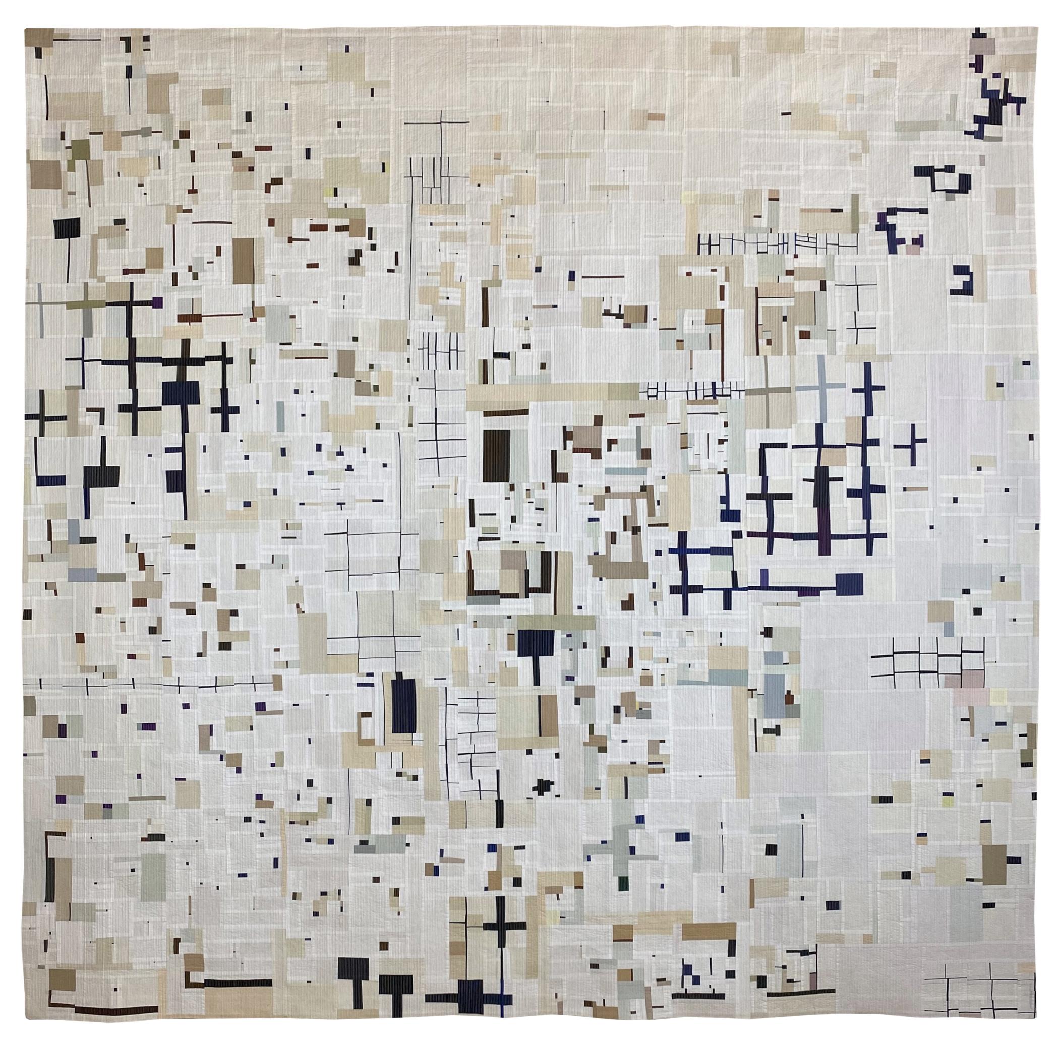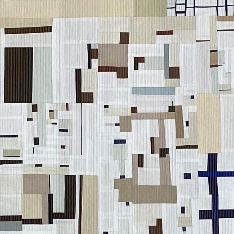 Playland #1 is bold and graphic and dazzlingly complex, yet minimalist in design. Seen from a distance it is compelling. Close up it reveals astonishing detail pieced from tiny bits of fabric. The form and color are simple— squares and rectangles in monochromatic black and white. For me, this is one of the most fabulous and dynamic attributes. Tiny pieces are sewn together to create a sleek, geometric work that highlights the very essence of minimalism.