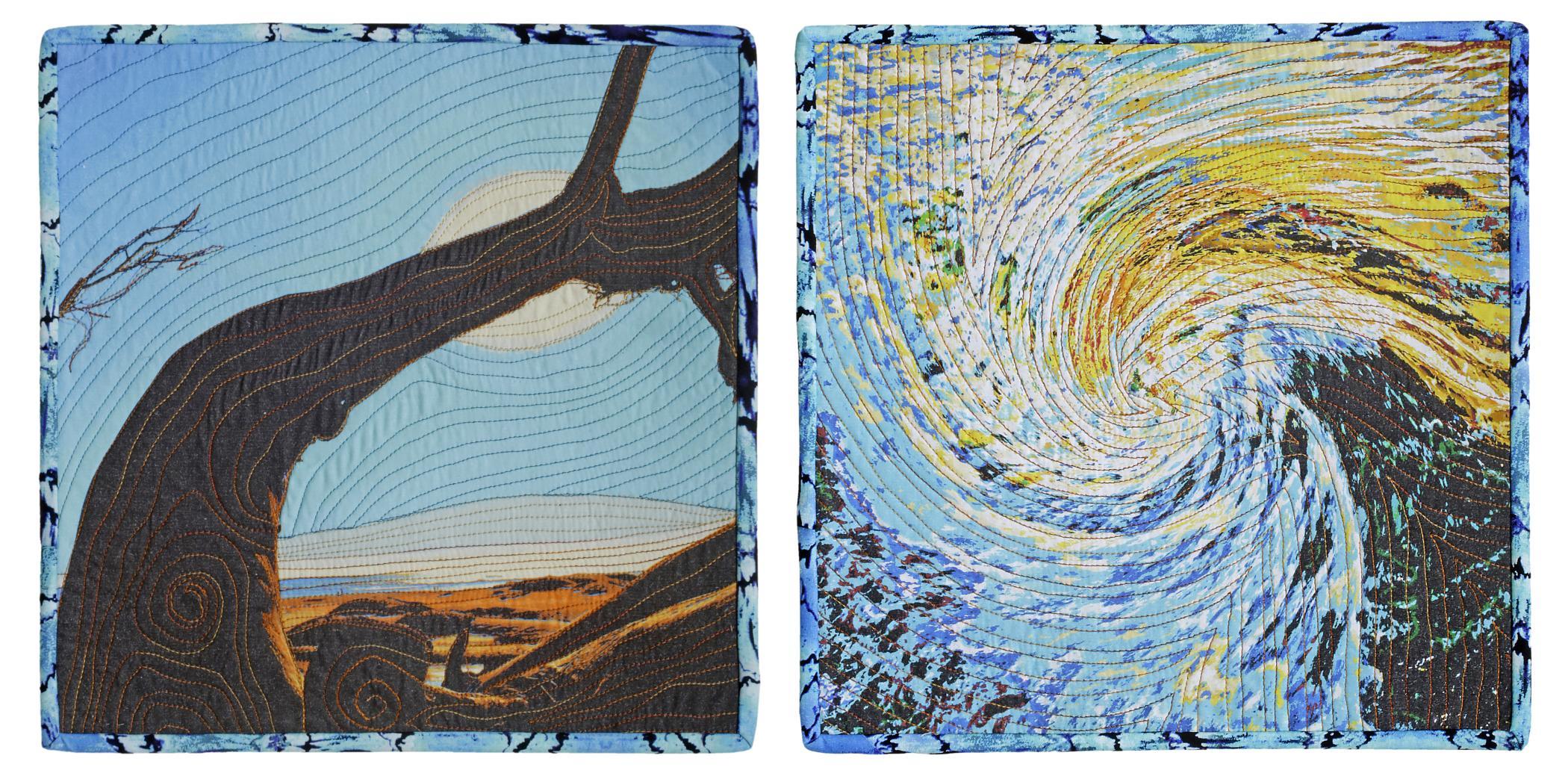 cotton cloth, eco felt, commercial cloth for binding created by artist for SAQA -Reflections- part of the Golden Hour line, threads