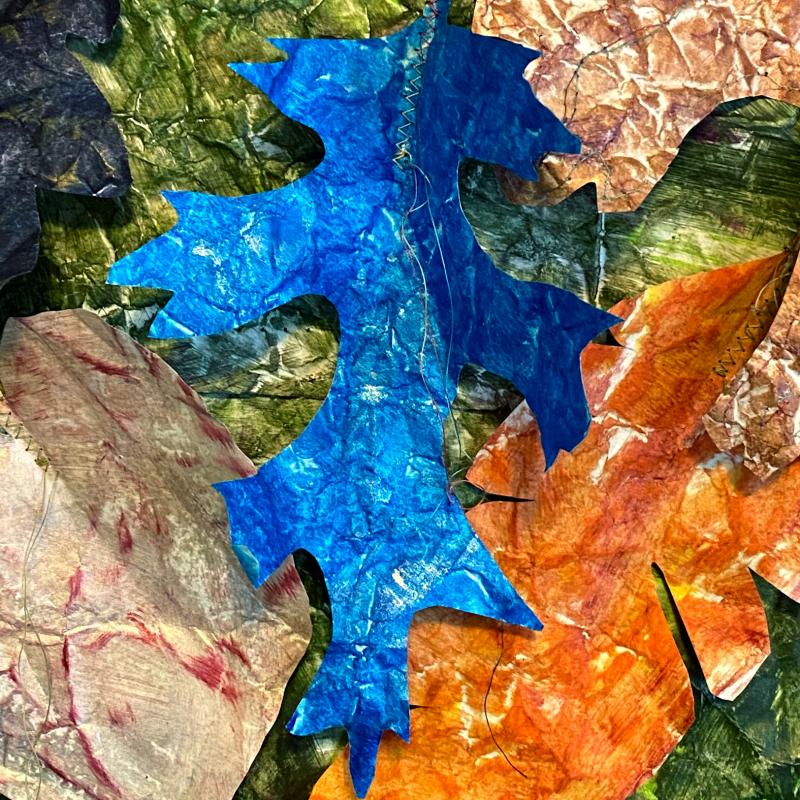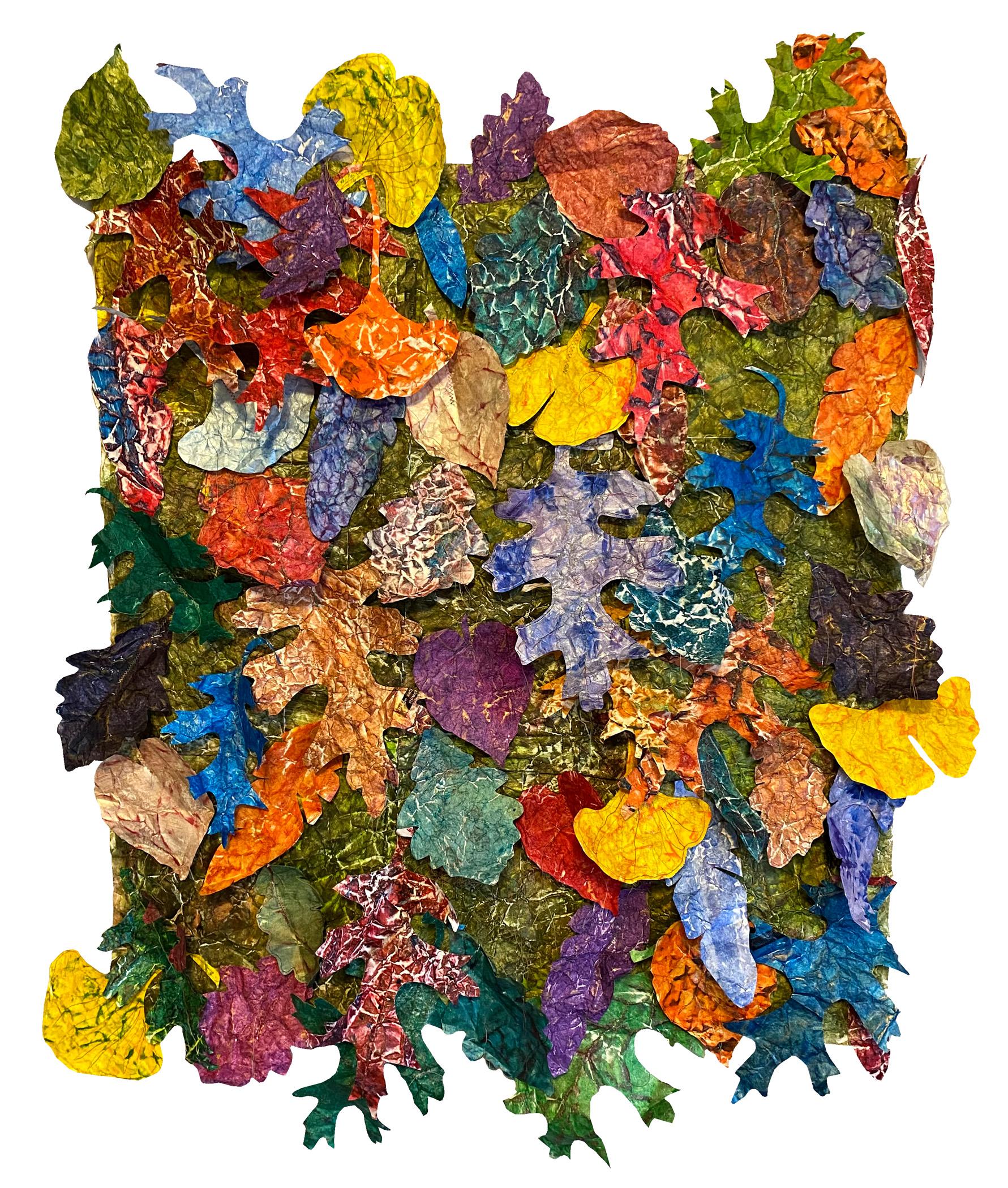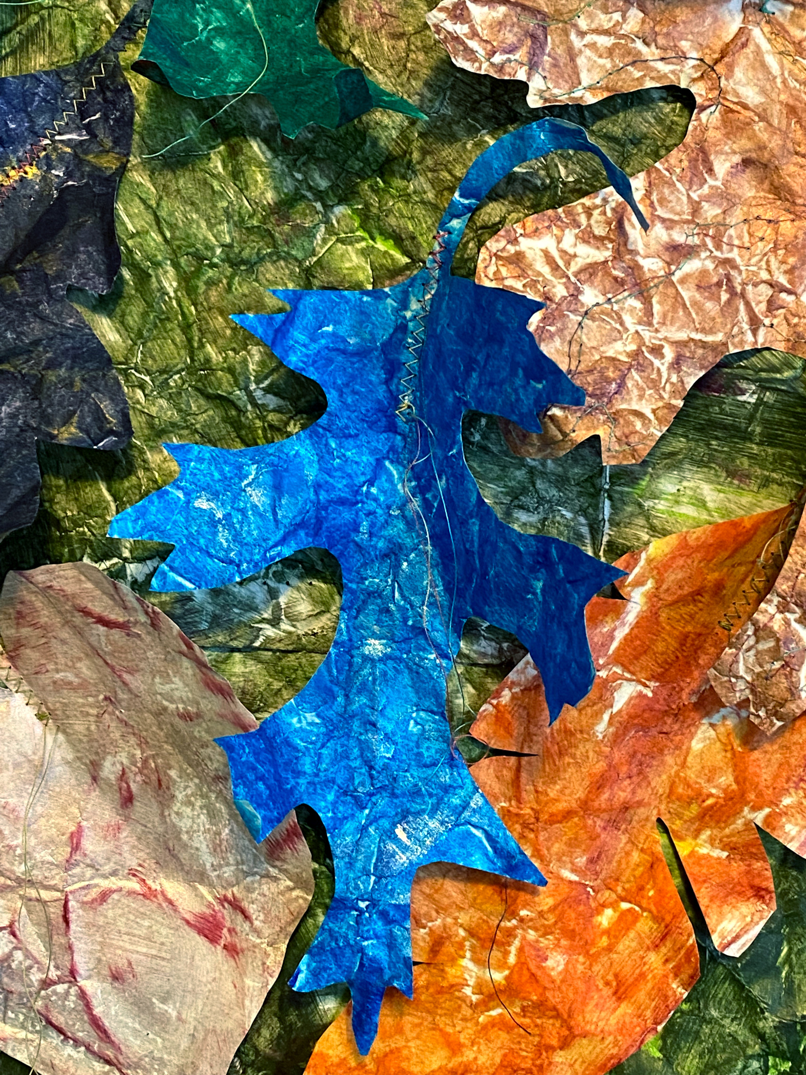 Consider not raking your yard in the autumn. By not raking, a mini ecosystem is created under the leaves, suitable for salamanders, butterflies, turtles, frogs, insects, worms, etc. These creatures lay their eggs under the leaf litter and feed on it in the process. Raking breaks this life cycle. Not raking also adds nutrients to the soil and increases soil health with leaf decomposition. I hope you will lift the leaves on this artwork and see the creatures under the surface.