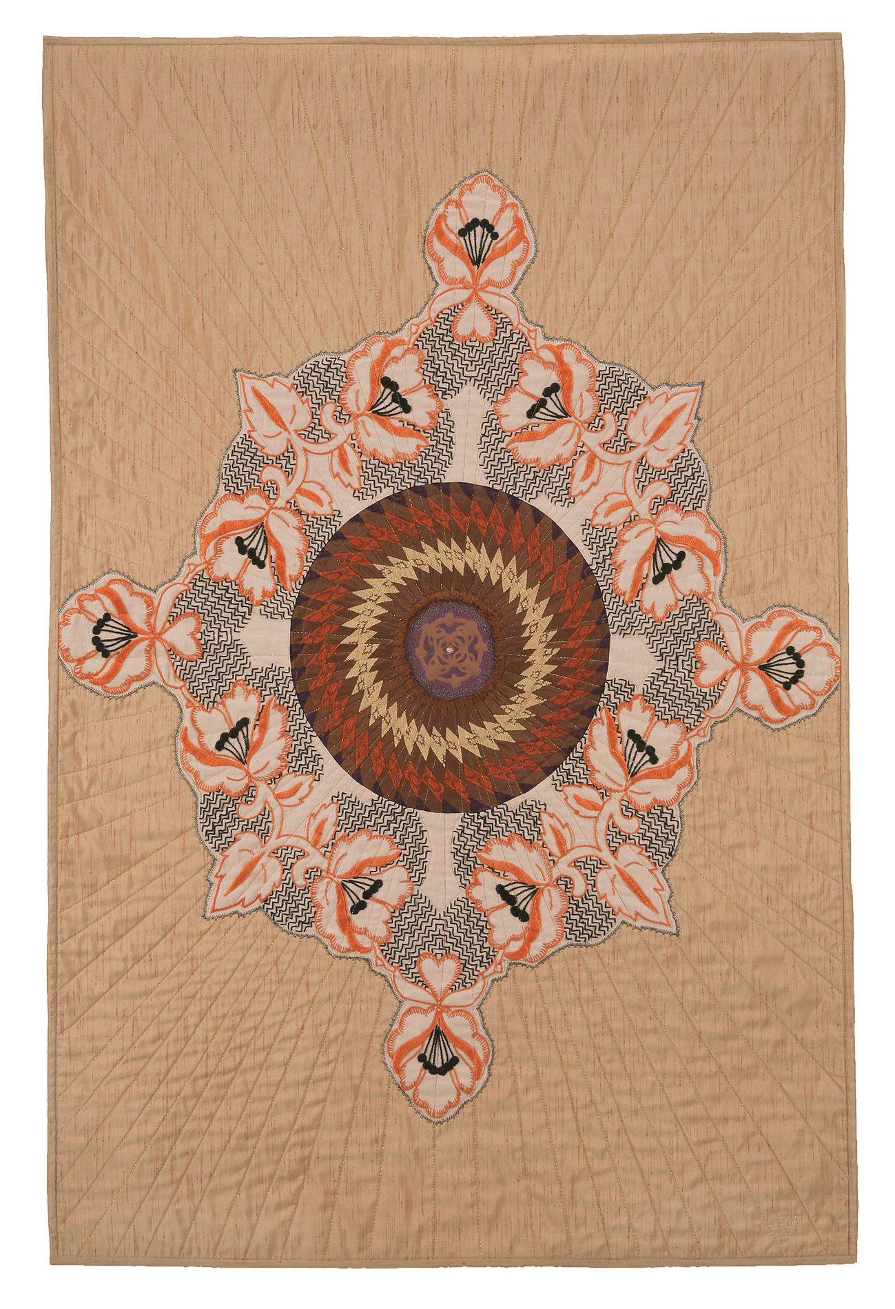 Portals: Past, Present, Future symbolizes the evolution of quilts. The outside ring represents the beginning of my sewing passion when my mother taught me embroidery stitches as a girl. The inner portal represents the techniques used by women in quilting bees, telling stories in their heirloom quilts. The center portal represents the independence of fine art quilters, whose creations go beyond the utilitarian bed quilts of our ancestors. The crystal at the very center represents the spirit that leads us forward, lights our path, and directs our way.