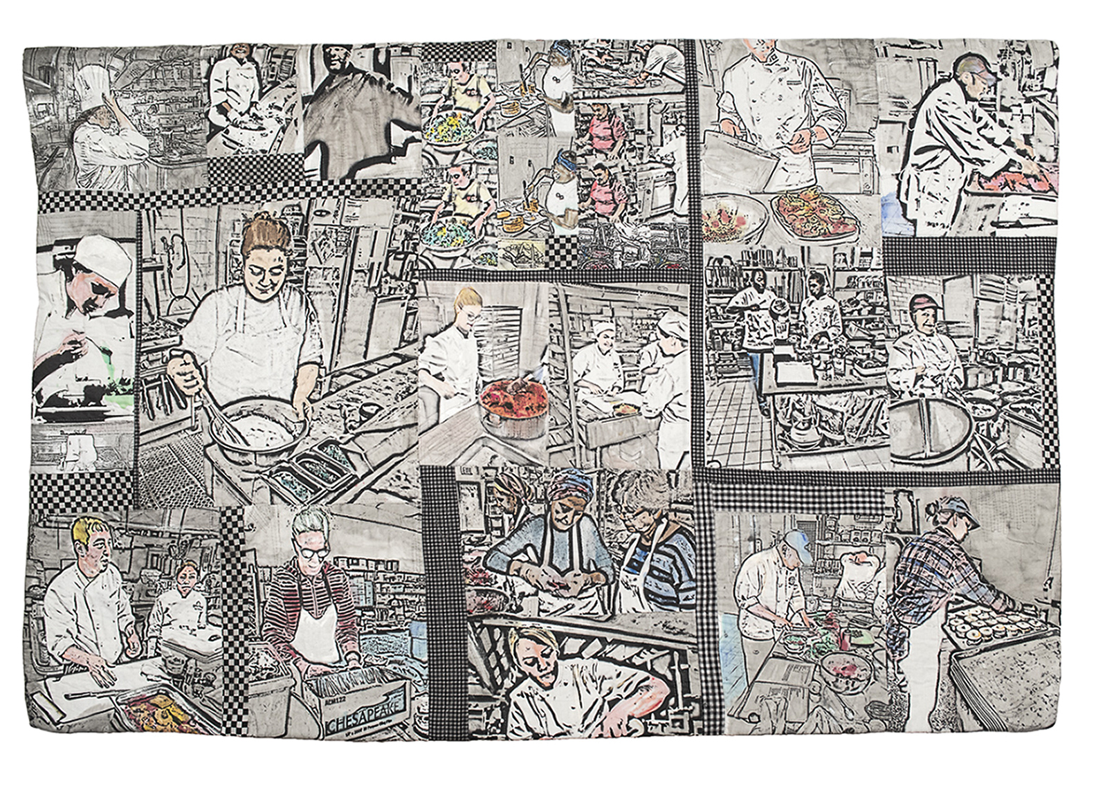 This piece honors the women and men who work in commercial kitchens. We don’t really know who they are, but they make the meals we eat in restaurants and take home to serve our families. They are not celebrity chefs we see on TV they are hard working people who brave hot stoves and sharp knives and very long hours. They are my hero’s. They live in a stainless steel landscape and love their job. They are every age and color. They cook with love.