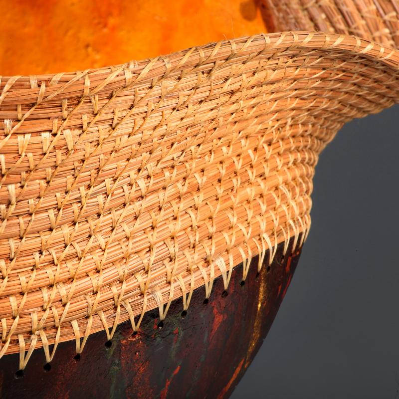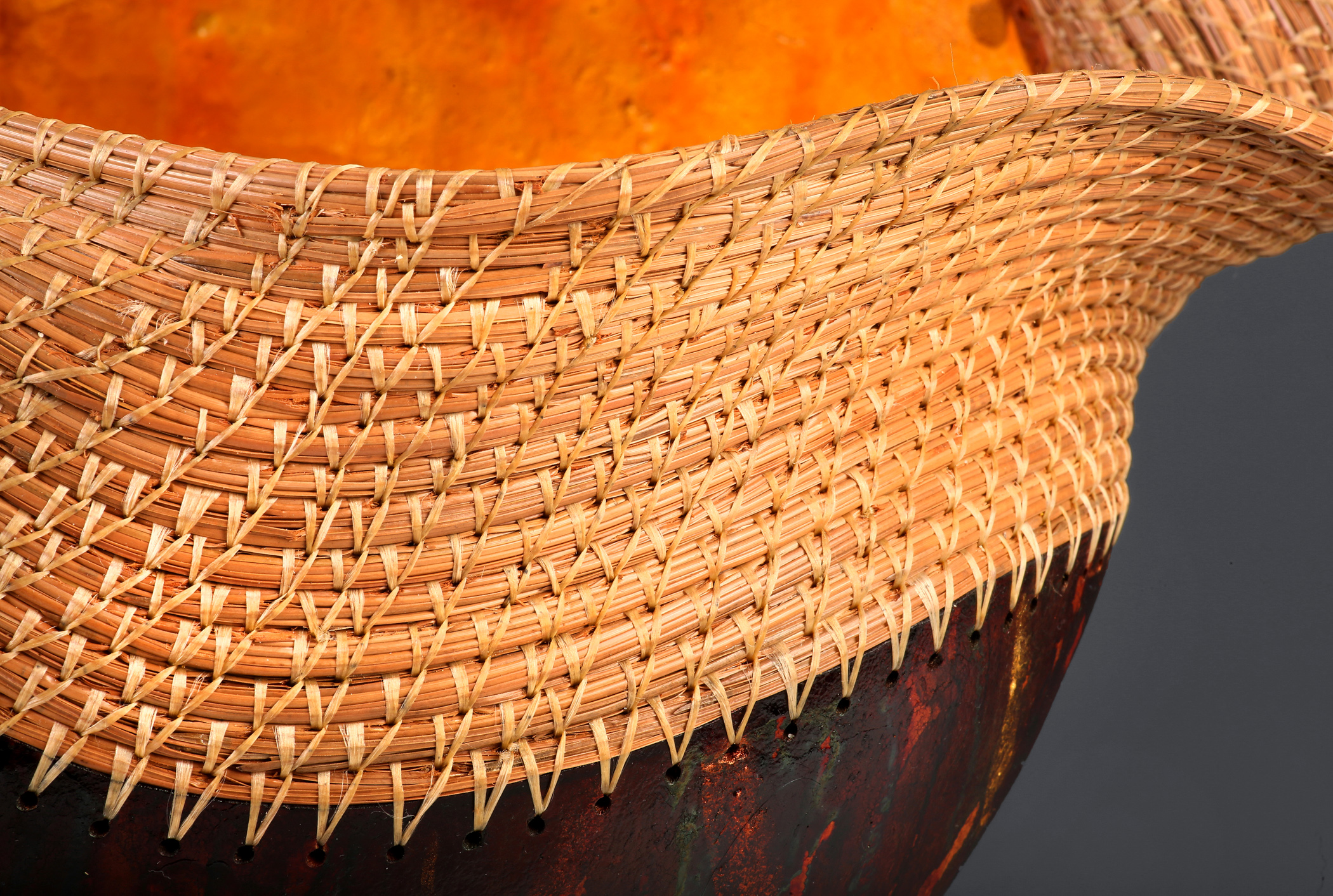 Large langaneria gourd, leather dyes, paint, southern pine needles, coiled