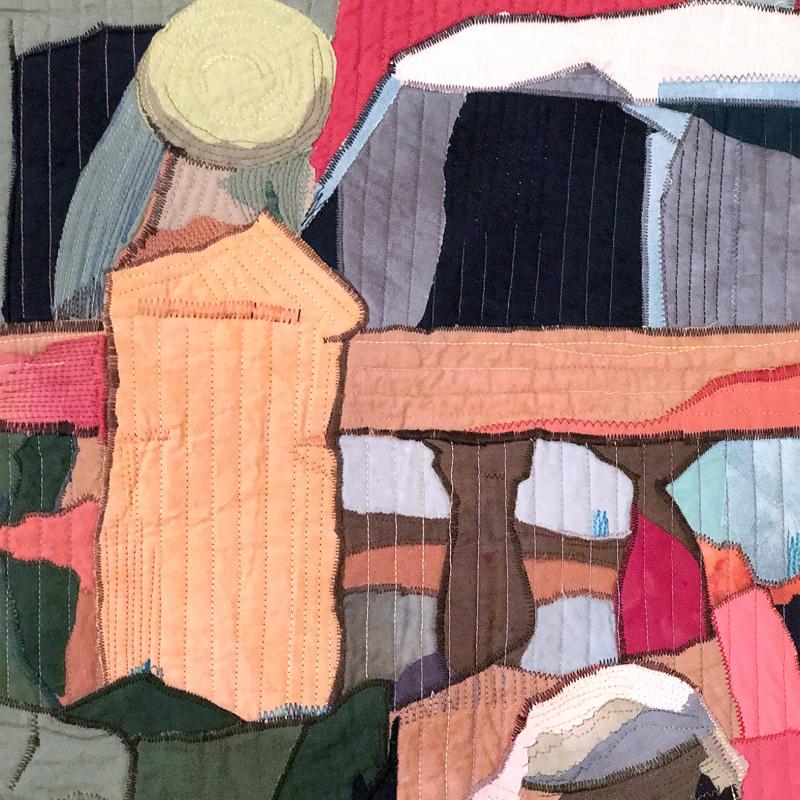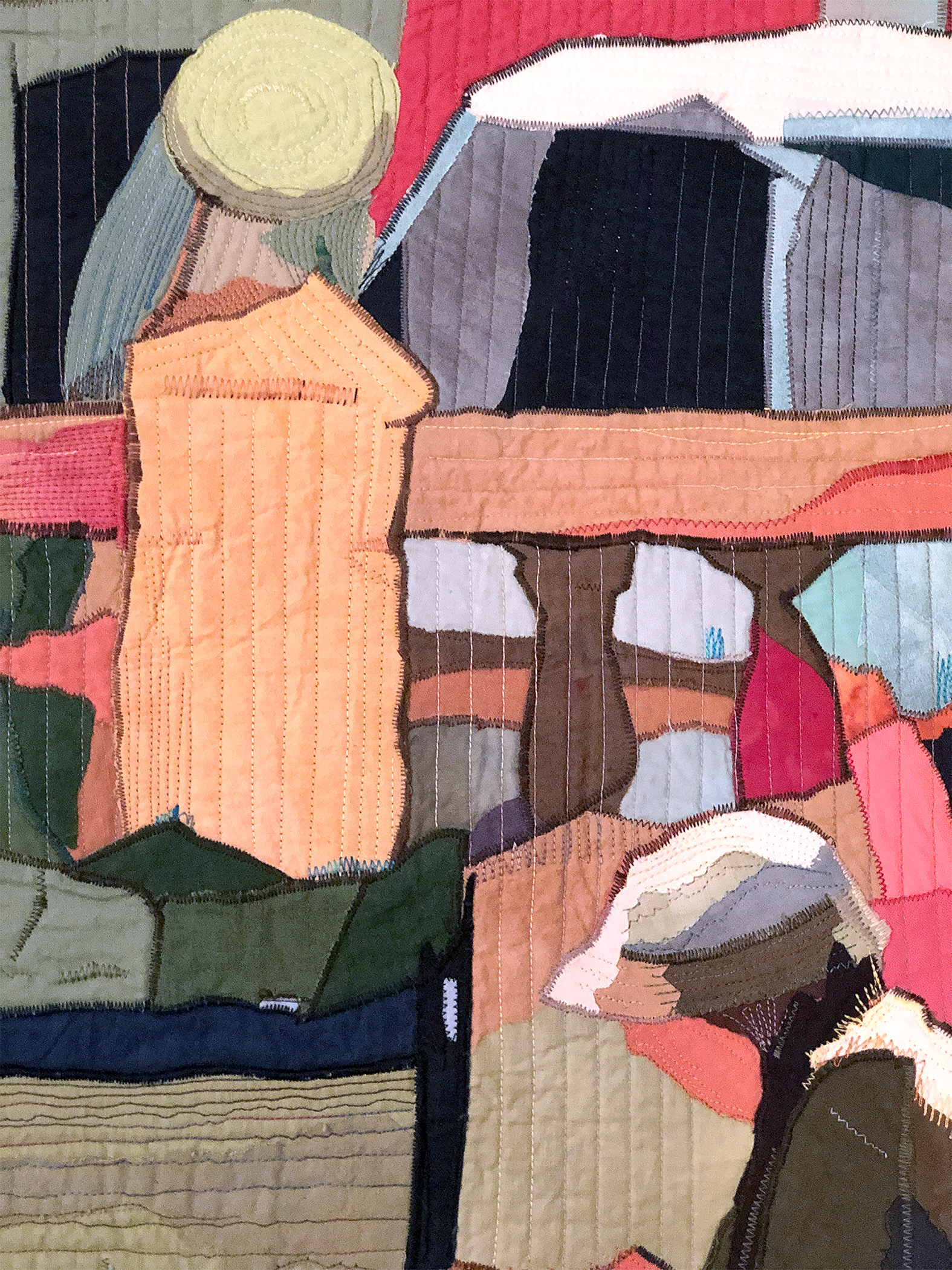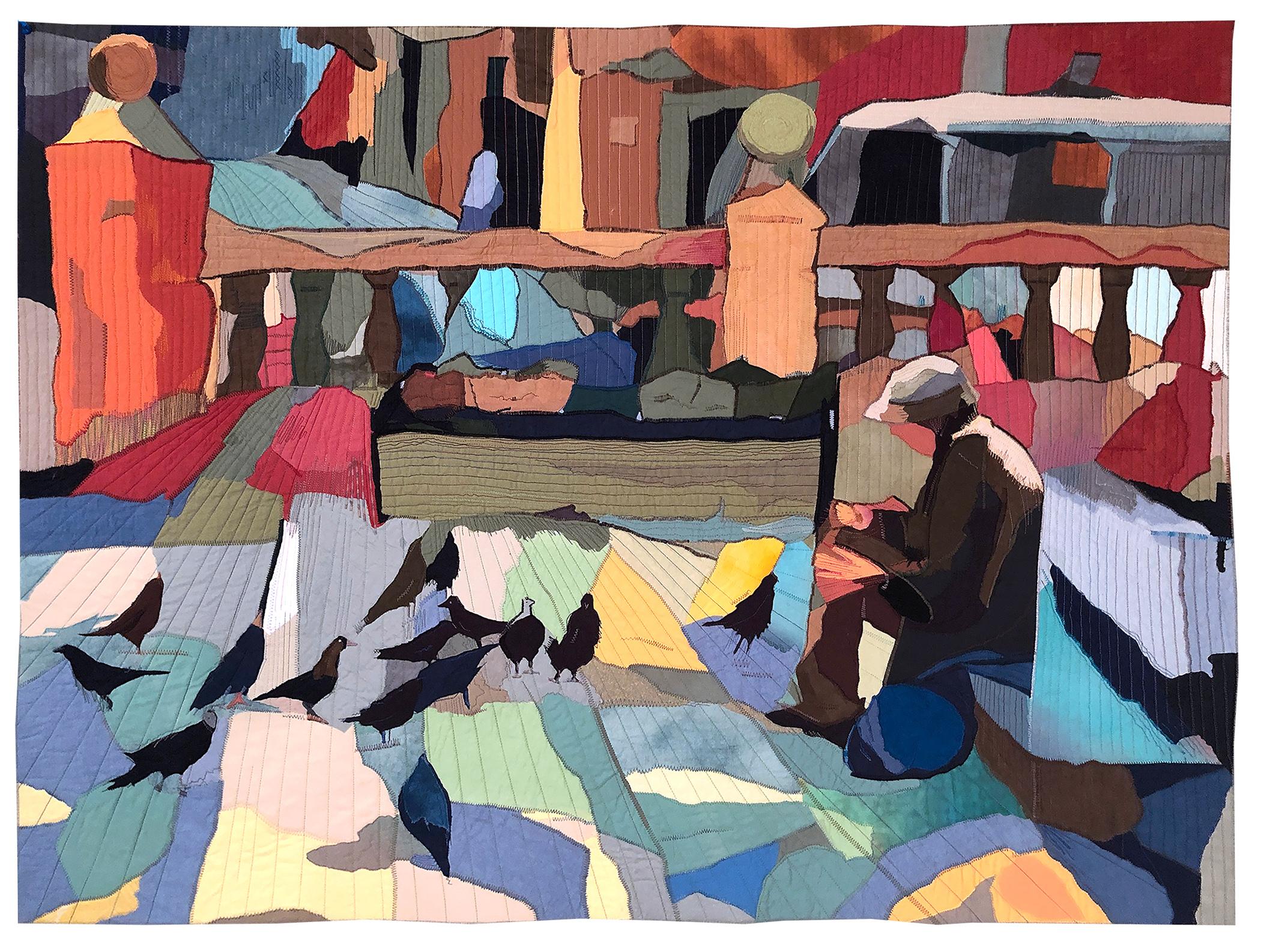 On an excursion to a village cathedral several summers ago, I captured a photograph of a plainly dressed man feeding birds in the church courtyard. In the busy midst of buses, shoppers, and tourists, the birds and the man shared a simple and probably frequent communion. The scene reminds me of stories of Saint Francis of Assisi— known to townsfolk as Poverello, “the poor one”—so I named the quilt Poverello and the Birds.