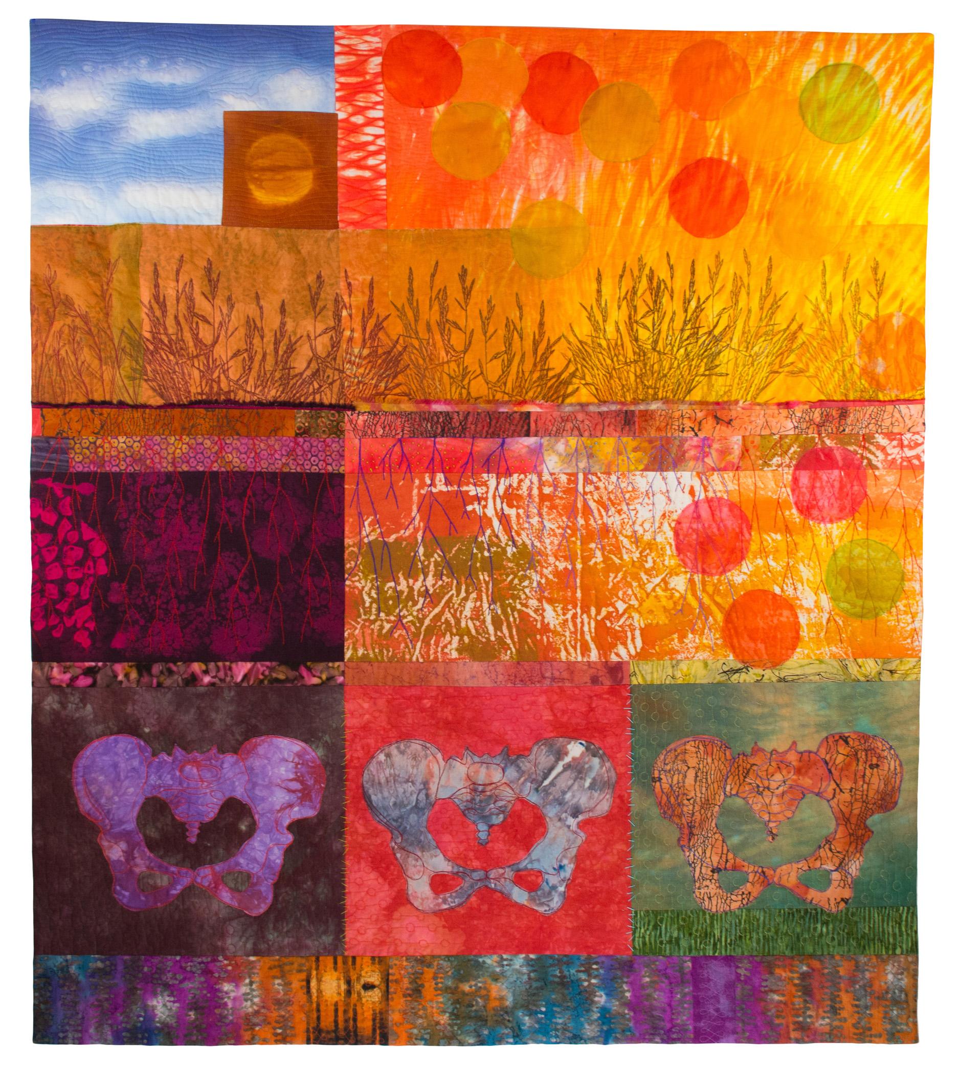 I was thinking of the magic of the prairie - the movement, light, and the sense of the enormous earth beneath the plants. The pelvises are a symbol of humanity's deep past, of our mothers, grandmothers, and all our female ancestors who opened the gateways of their bodies for us to pour forth. These ancestors emerged from and faded back into the earth, intertwined with the plant life they depended on.