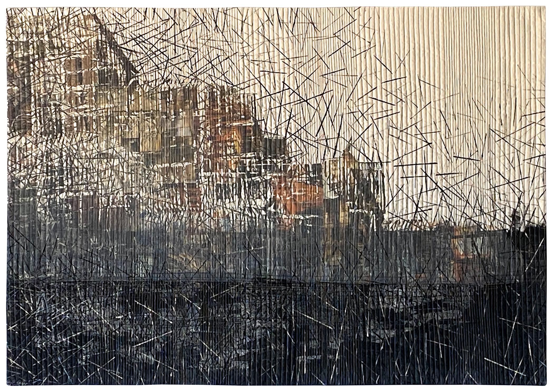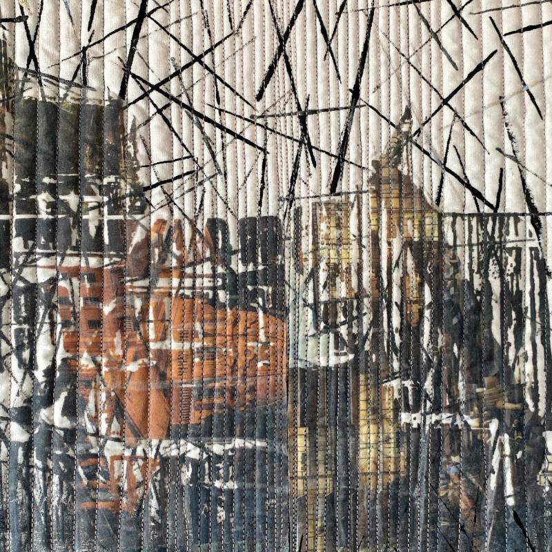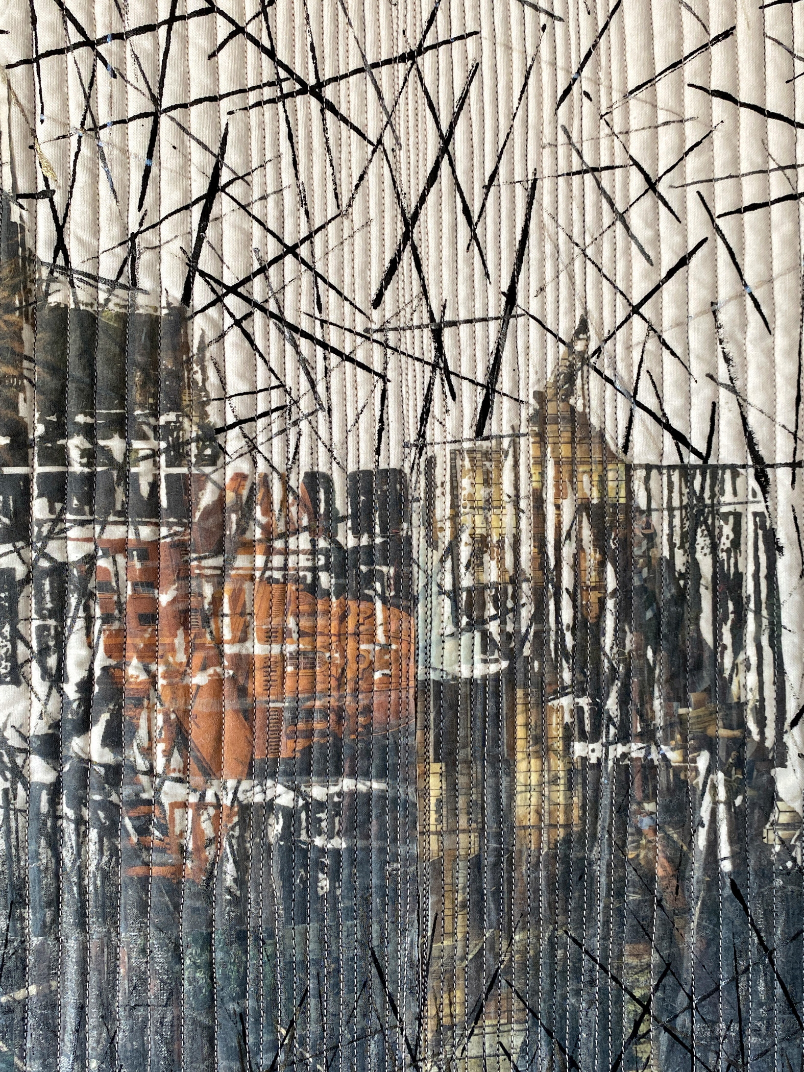 Cotton, fabric paint, organza, paper, matte medium, fusible web, monoprinted, painted, machine quilted, fused paper laminated