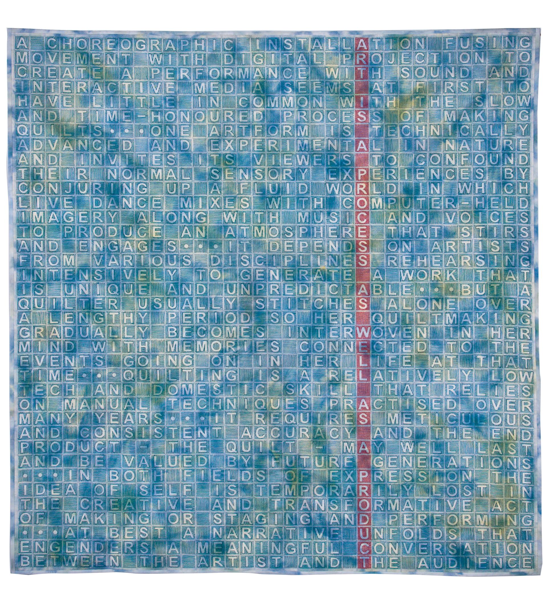 The process of making is important to quilters. To draw attention to this, I wrote the text to contrast quilting with another artform: contemporary dance. They differ profoundly both in the finished product and how they are produced, but each draws on a lengthy and painstaking creative period to establish a dialogue with the audience.