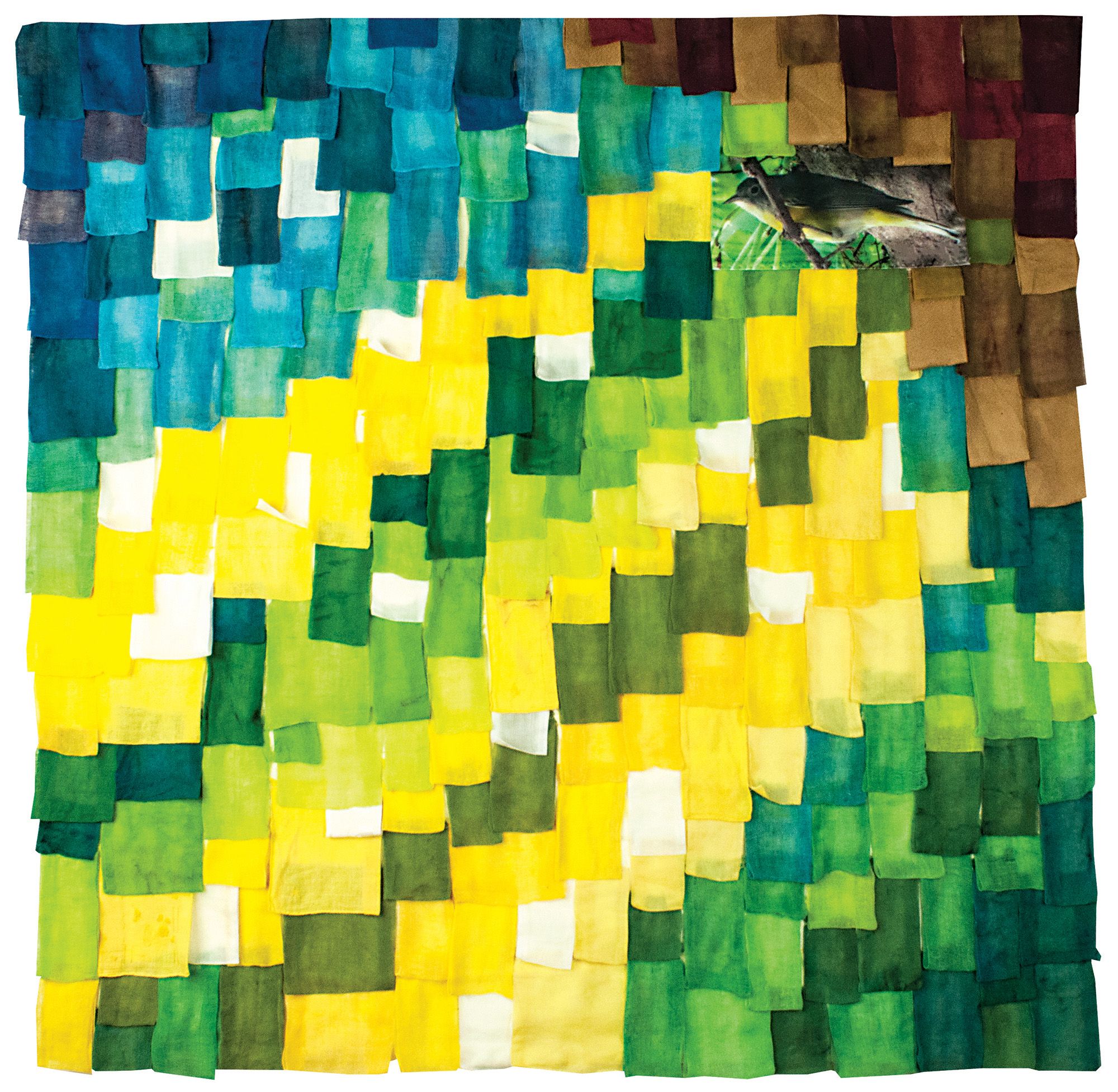 Every year finches migrate through my back yard, seeking shelter under the cover of green leaves. The “leaves” in this piece are shown as over 200 individually dyed and sewn folded rectangles that overlap. Like in nature, where no two leaves are identical, these rectangles vary in material, size, and color.