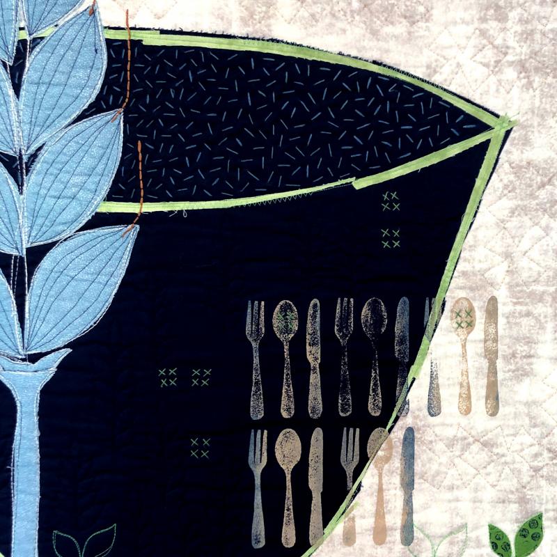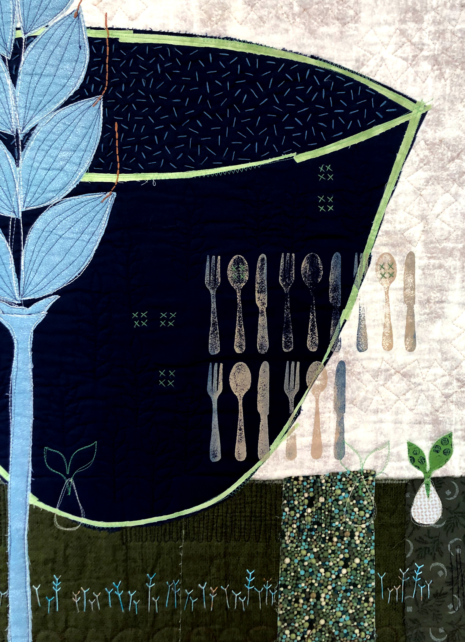 Fused appliqué, surface designed, hand embroidered, free motion quilted