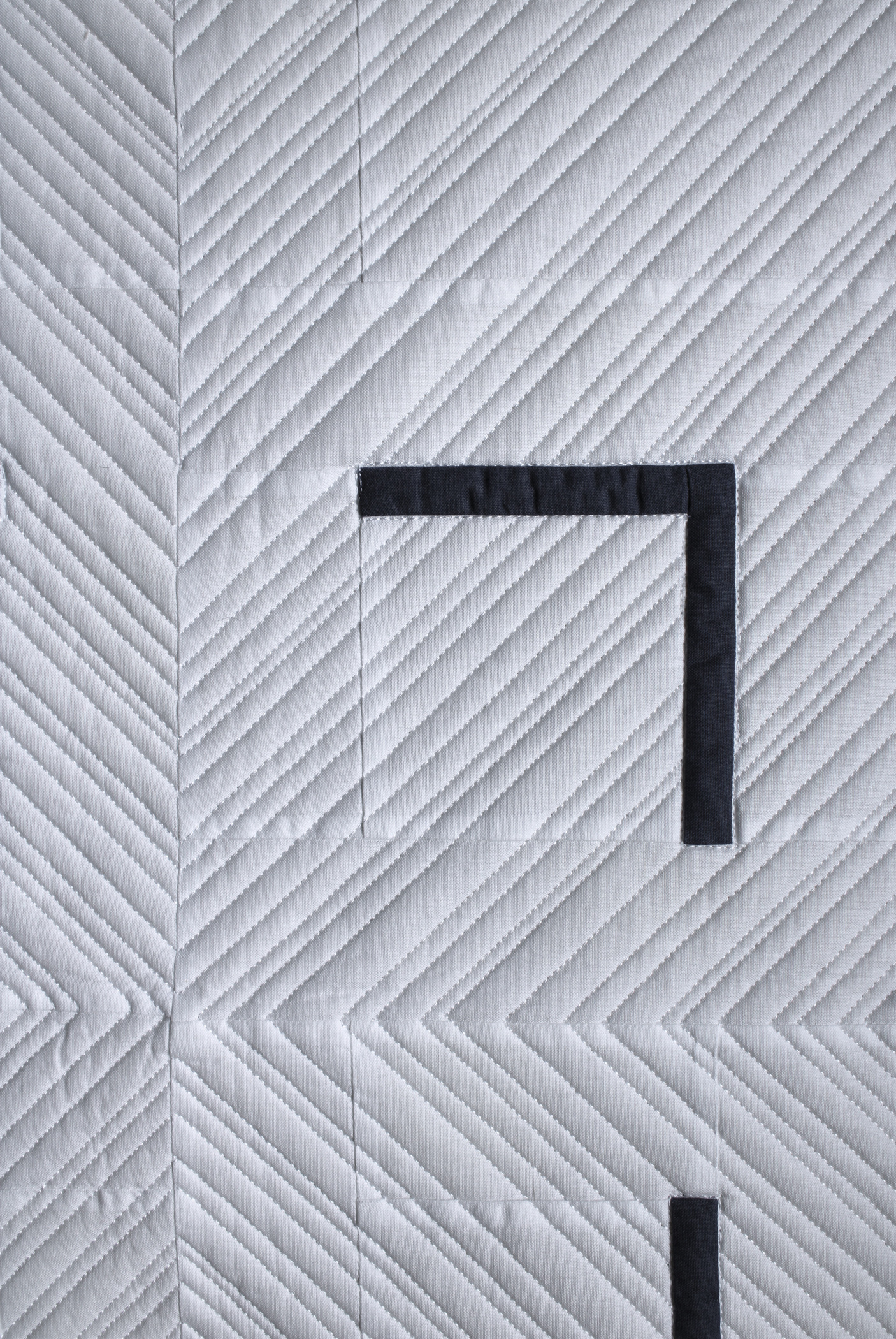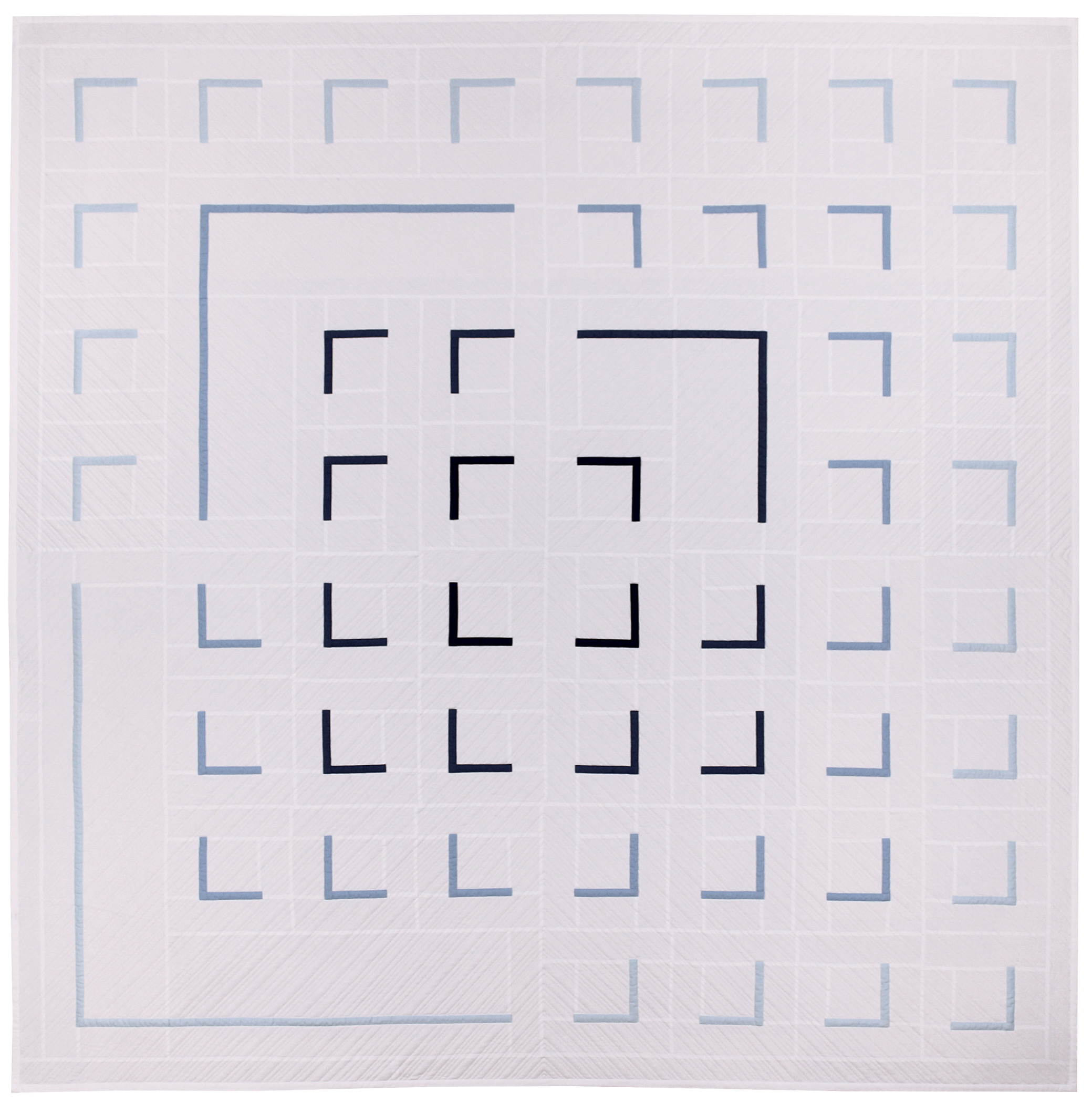The design possibilities that the simple right angle allowed for intrigued me. Quarter Turn Medallion is part of a series of quilts I made as I explored what I could do with the “quarter turn.” The ombre color, larger right angles, and radiating quilting lines add dynamics to the piece.