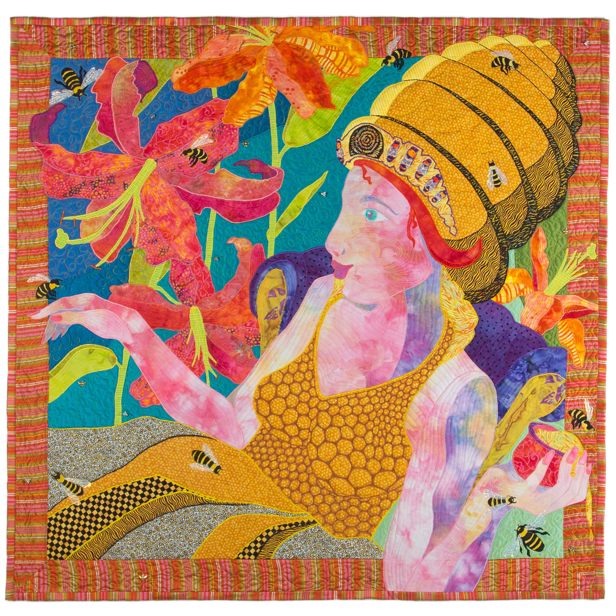 Because I dreamed her, I could see her completed as a quilt and creating her was simply a joy. As I was beginning her, a call came up for butterfly quilts for the Texas Quilt Museum and into my brain hatched the beginning of a series; not just one piece. Mariposa had to be drawn immediately after Queen Bee and was actually completed before Queen Bee to make the call to which she was accepted. The two have never been hung together until lately when Mariposa came home. They both reside now in my home facing each other.