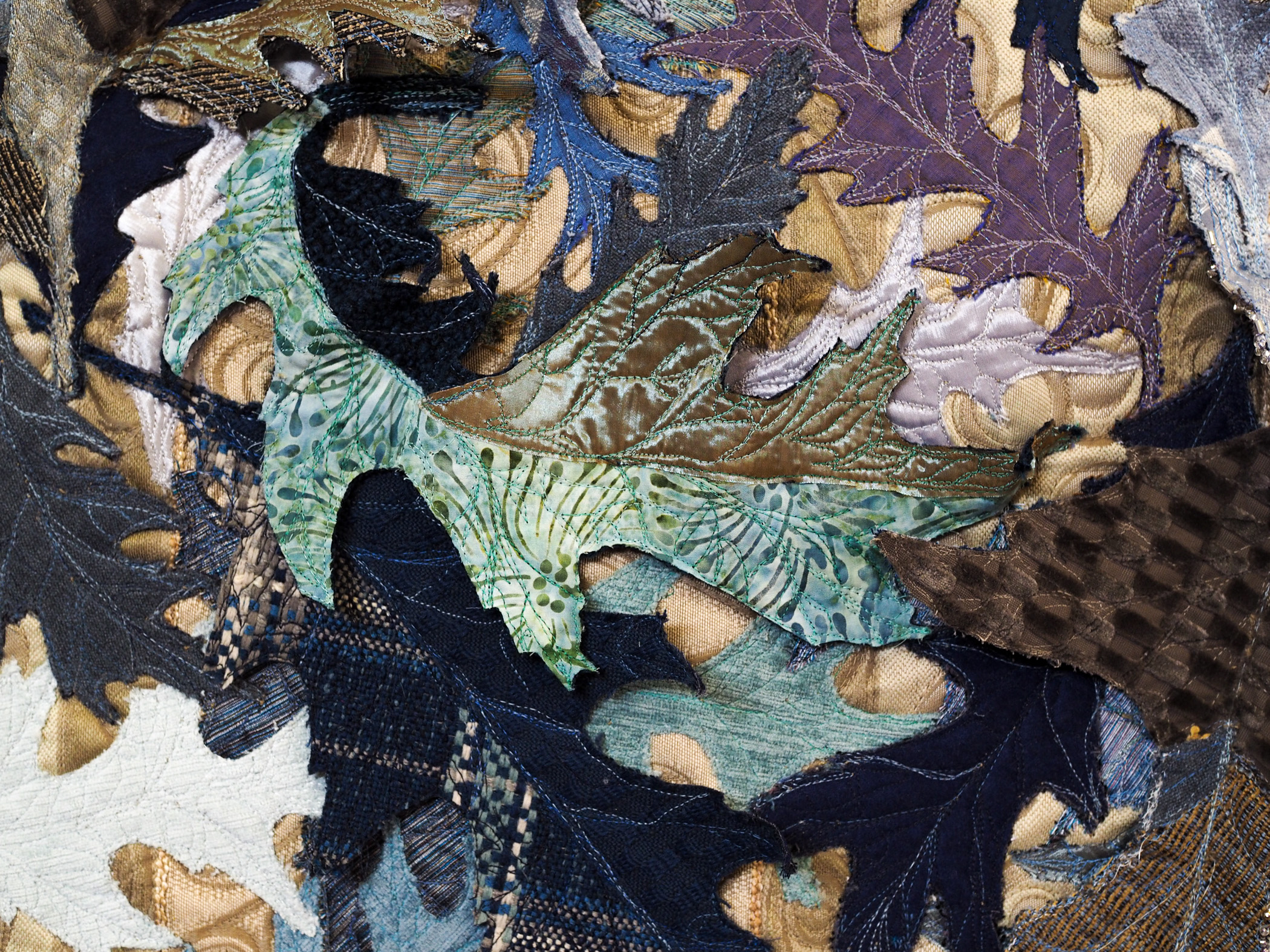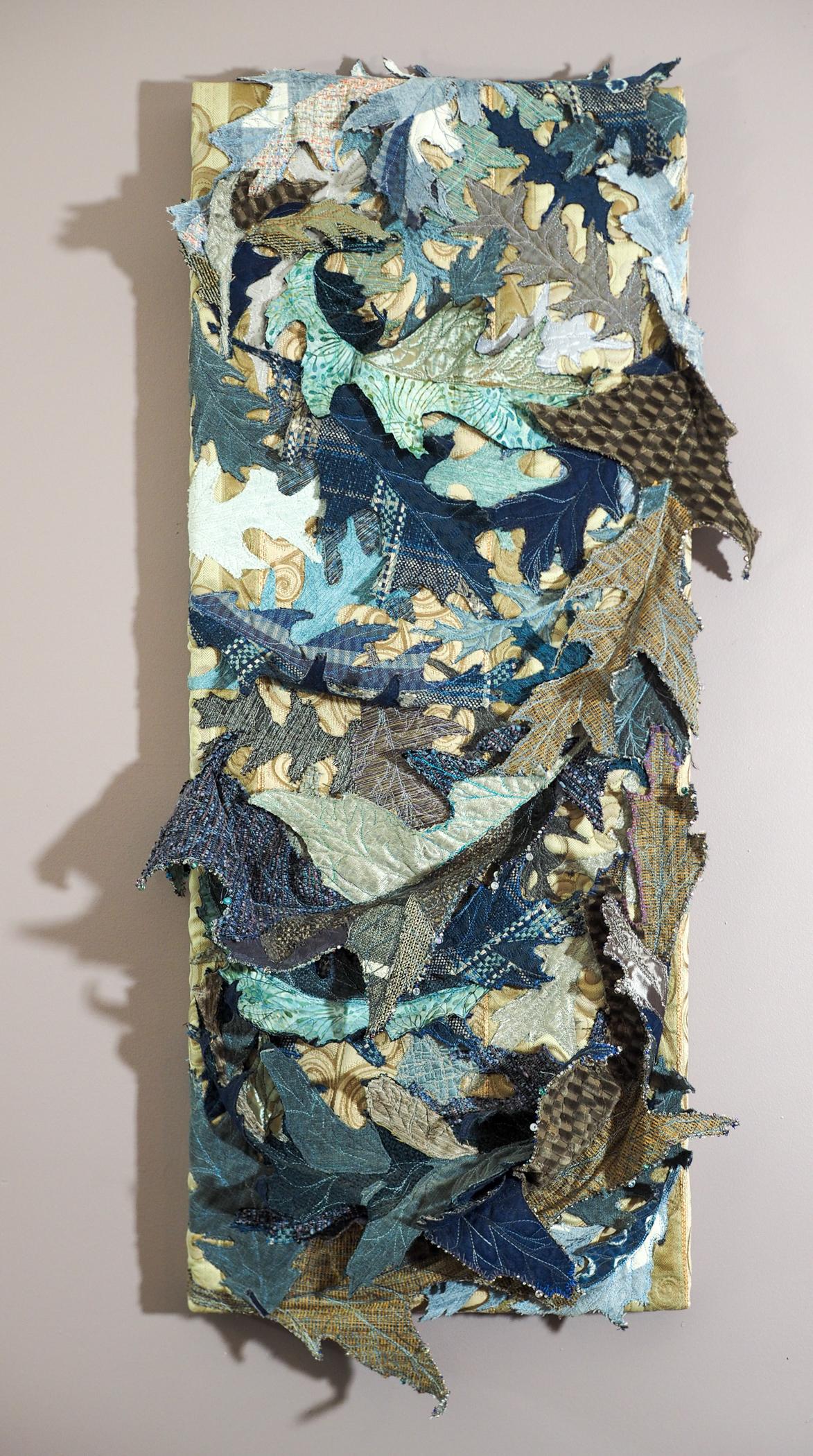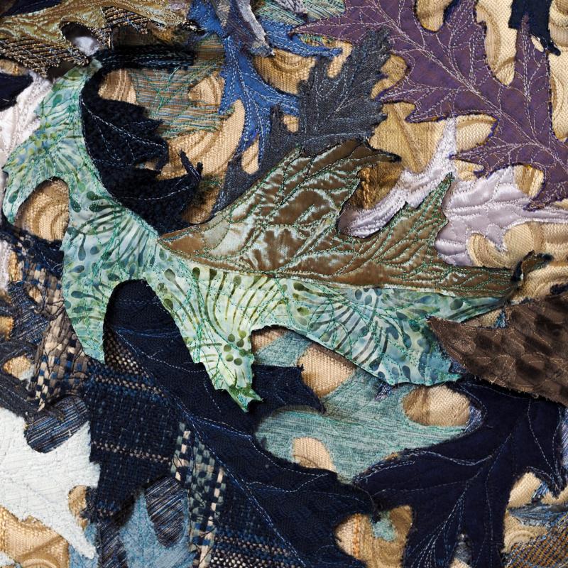 The long-lived oak supports more life than any other North American tree & the leaves come in many unique shapes. Selecting each 'recycled' designer sample fabric piece, hand-cutting to the shape of each leaf choosing texture, color & fabric brings me peace. The restrictions of using a small piece of fabric that cannot be replaced yet would have ended up in the trash I find balance between letting go and holding on. Both machine & hand work fulfill different aspects of my creativity.