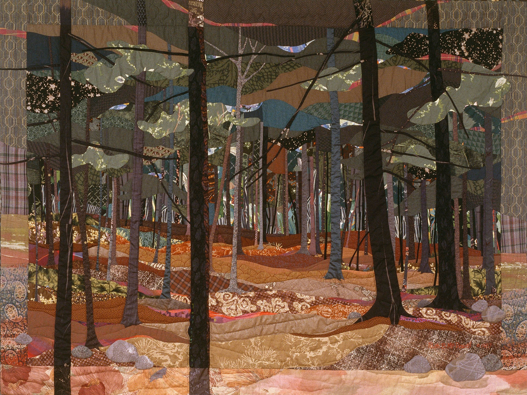 This quilt was drawn with more organic seams than a ruler would produce, a departure from most of my previous quilts. Inspired by a favorite pine forest, I really wanted to capture that sense of place. When choosing fabrics, I aimed for a lot of implied depth, and an impressionistic rendering of the hues and textures.