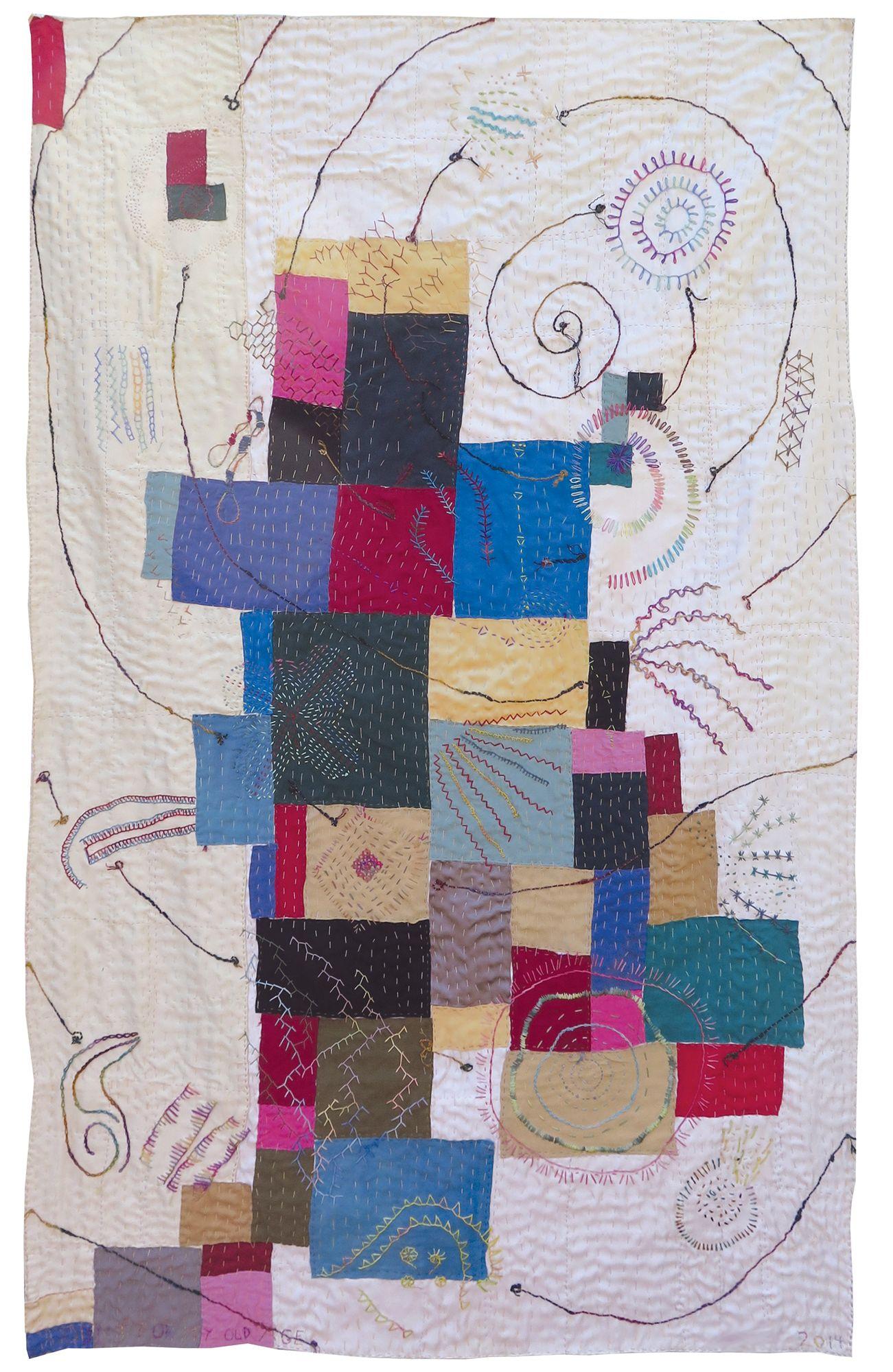 The white areas in this piece are made from silk blouses purchased at the Goodwill store. The middle layer is also silk. When I am old and feeble, I may not be able to see or to quilt, but I will be able to enjoy the luxurious feeling of the silk and the texture of the needlework. Maybe I will remember the joys of quilting, or maybe I will just enjoy the moment.