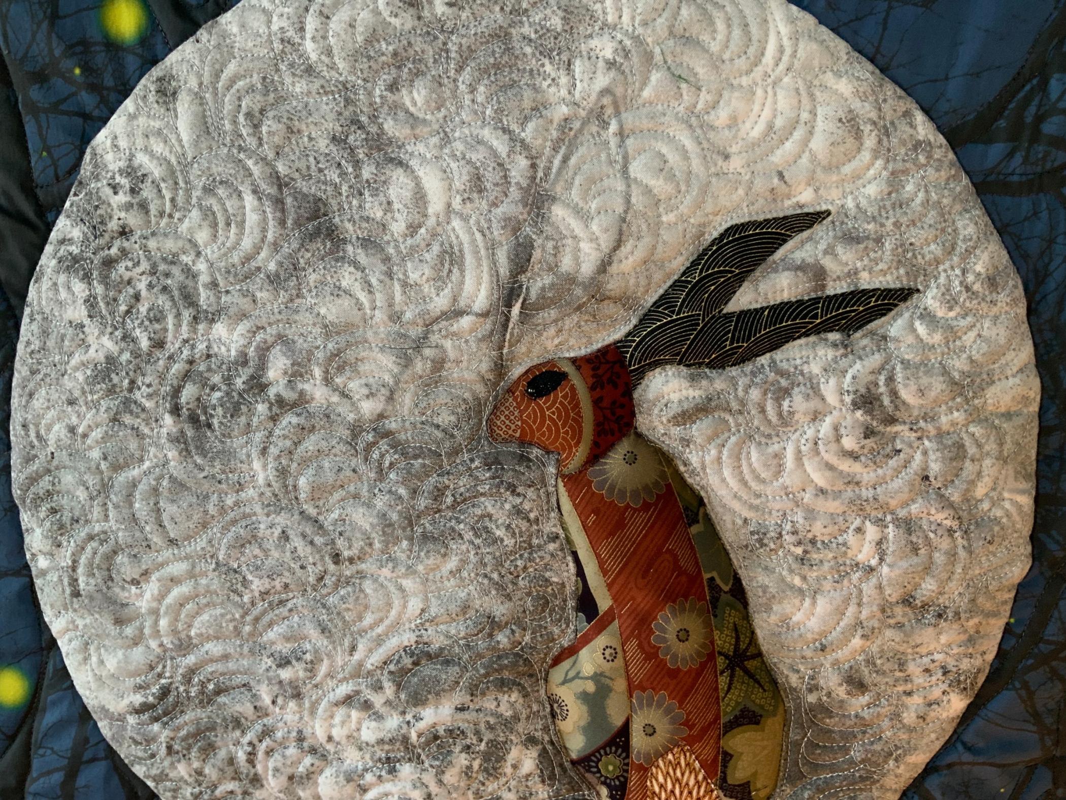 What do you see when you view a full moon? I avidly observe each month’s full moon and have often asked friends if they could see a rabbit there. I discovered a Japanese folklore tale of selflessness that tells this story: One night, the Man of the Moon came to earth disguised as a beggar asking for food. A rabbit, who had only grass to offer, threw himself on the fire to feed the beggar. Touched by this generosity, the Man of the Moon placed the rabbit’s image on the moon for all to see. This tale was the inspiration for my piece. My rabbit is depicted in oriental fabric to honor the origin of this fable.