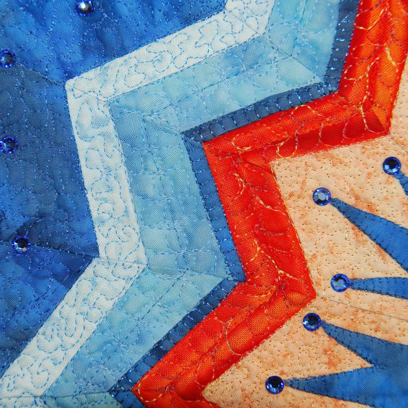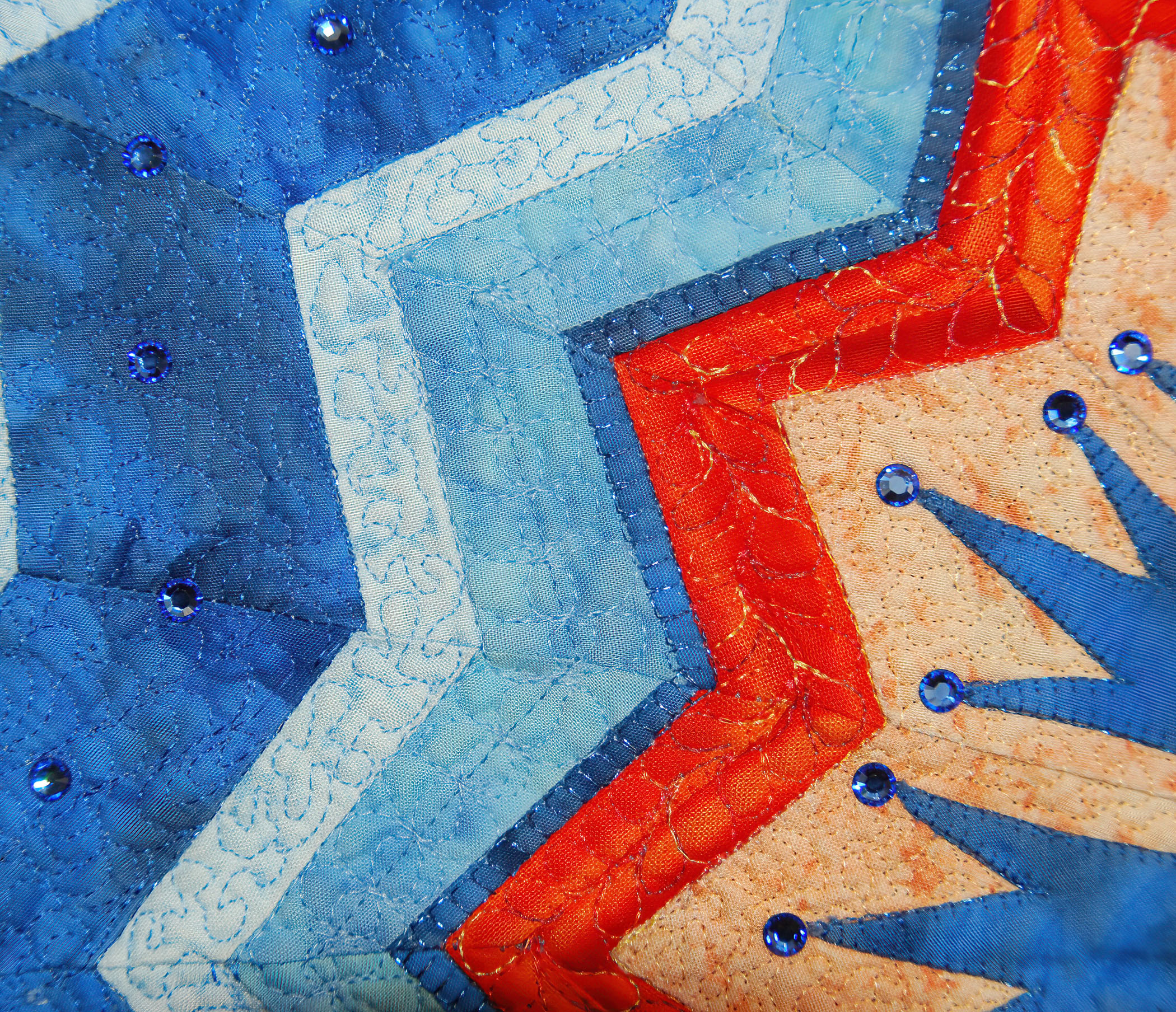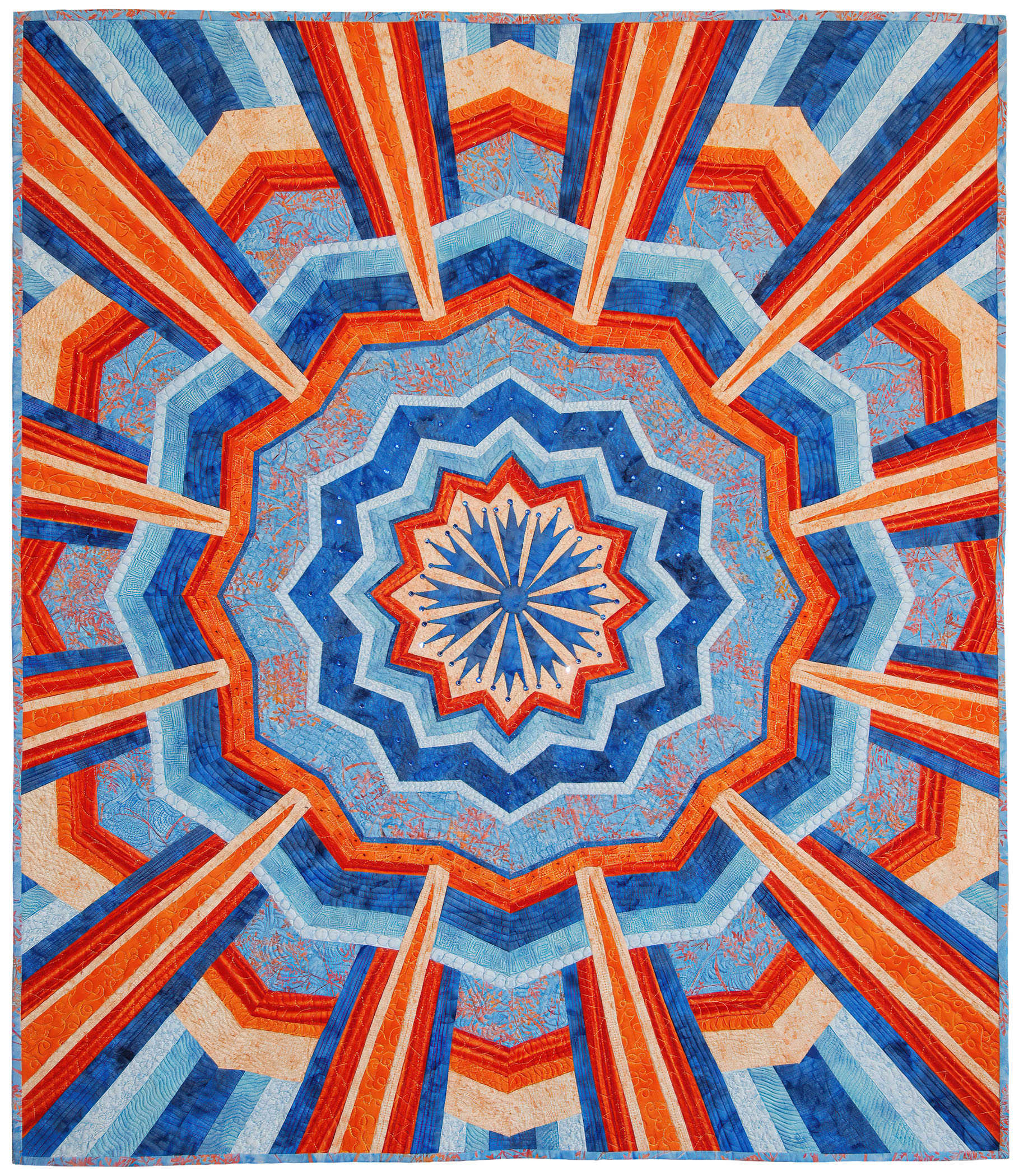 Using the selected fabrics, I brought an image into a program on my iPad and designed the quilt. Once I decided which design to use, I drafted the pattern. The quilt is paper pieced but required every other wedge to be finished by hand so each seam would "nest" with the wedge beside it.