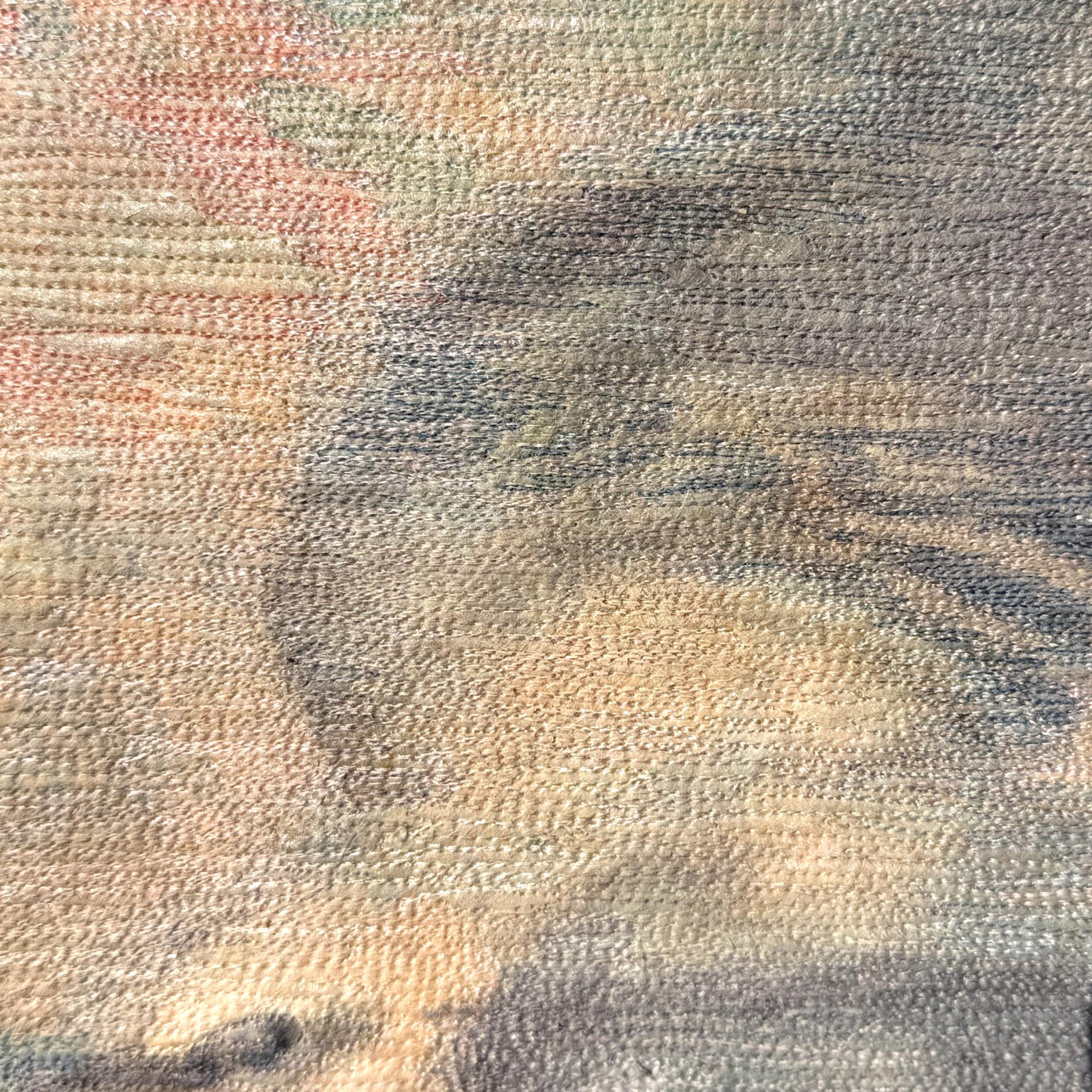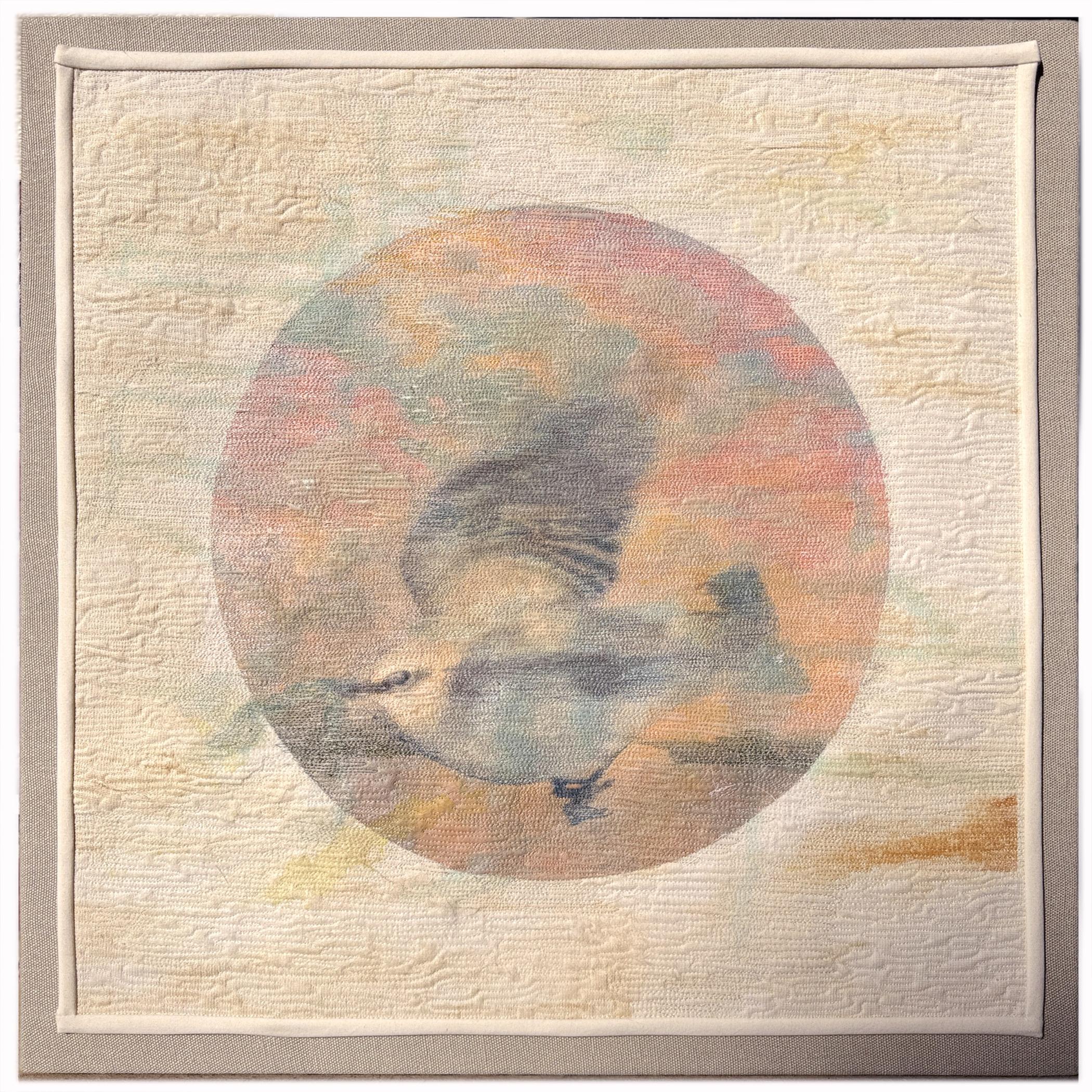 Rare Sighting is a photoshop-composited image. One of my oil paintings and a photograph of a yellow-rumped warbler were layered, blended, then digitally printed on cotton. The printed image was then machine appliquéd to a salvaged remnant of fabric, heavily embroidered, and quilted. Because I'm a painter, it's also touched in places with oil sticks. I use the AI tools offered in Photoshop as I would any new brush. My current work integrates my parallel studio practices of oil painter, photographer, and textile artist.