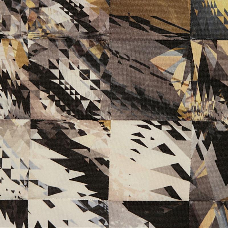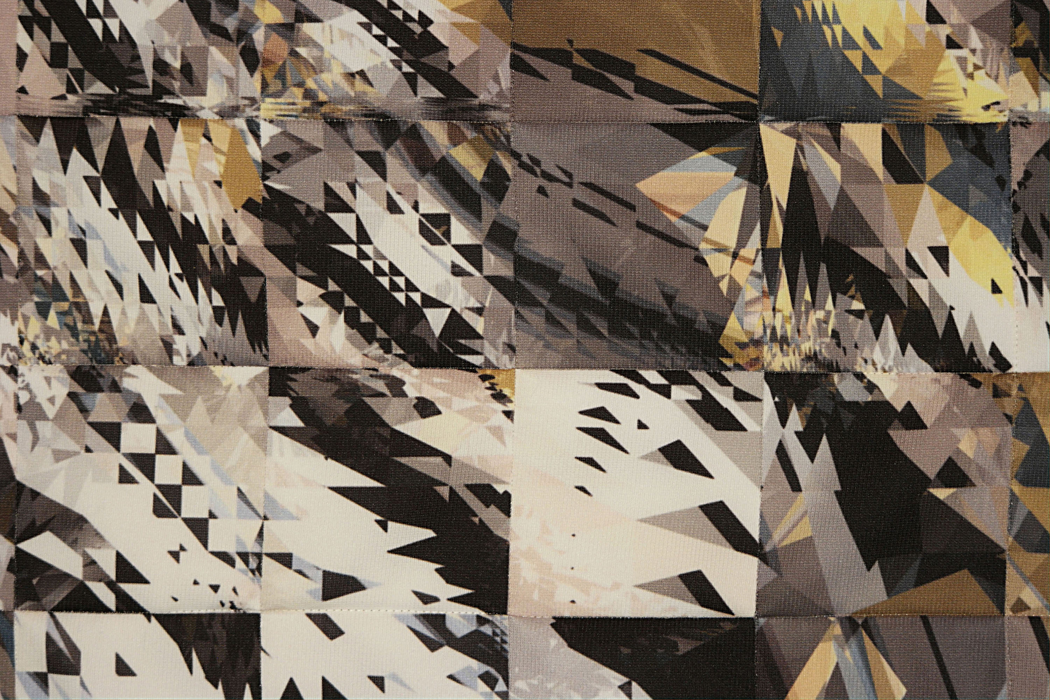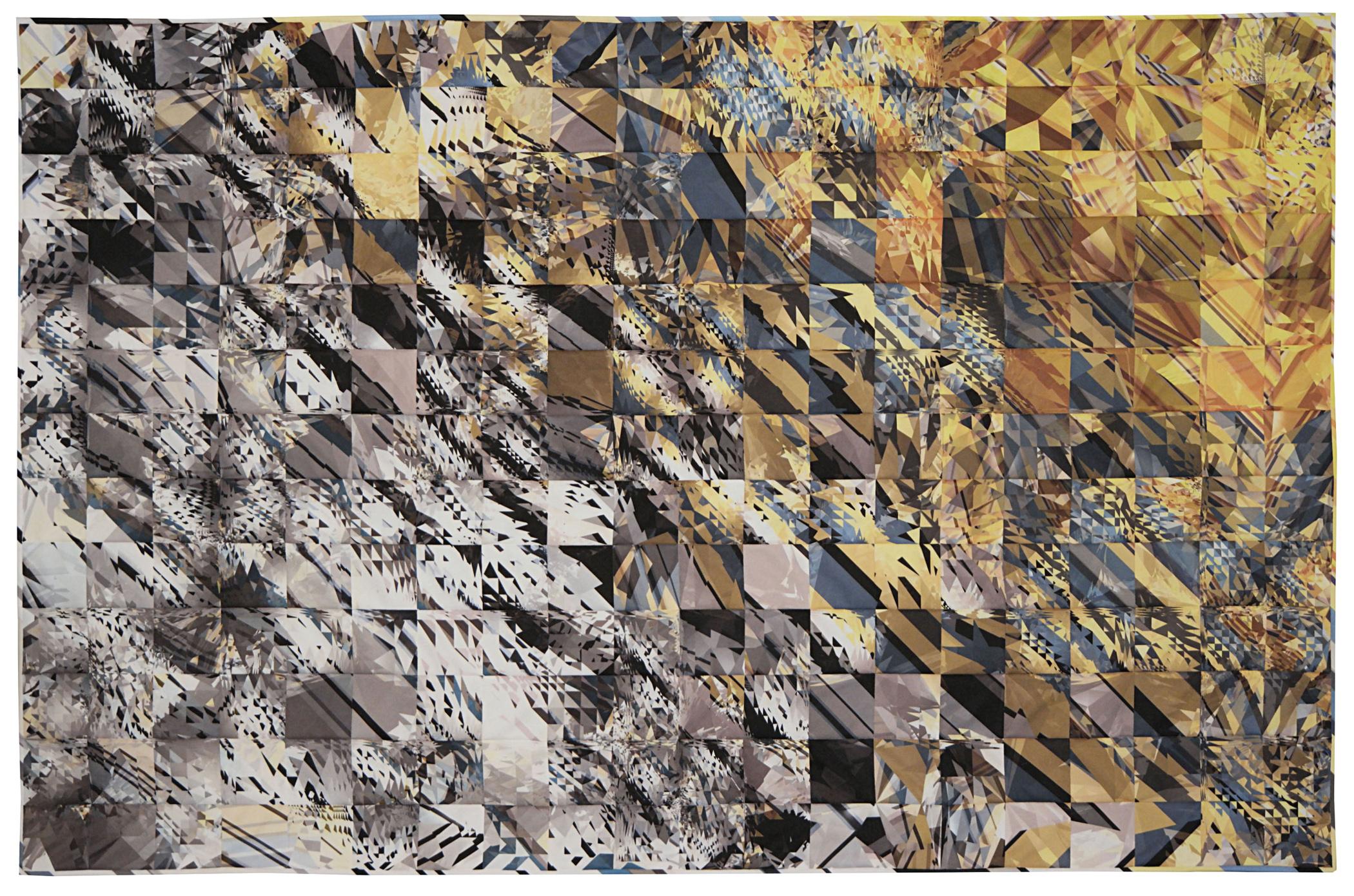 In 3D computer graphics, ray tracing is an algorithm that traces the paths of light rays as they interact with virtual objects in a modeled scene. To create the image for my quilt, I modeled a large plane covered by diagonal, parallel stripes with a rectangular slab of glass above it. I deformed the top of the glass slab to form an array of squares. Each square has sharp peaks and depressions defined by triangular facets. Rendering software used trillions of rays to produce the final rendering, which views the glass from above. The diagonal stripes can be seen on the edges of the quilt, beyond the borders of the glass slab.