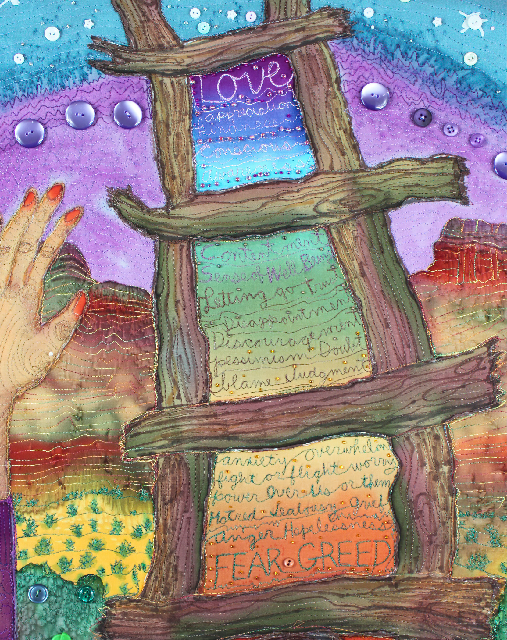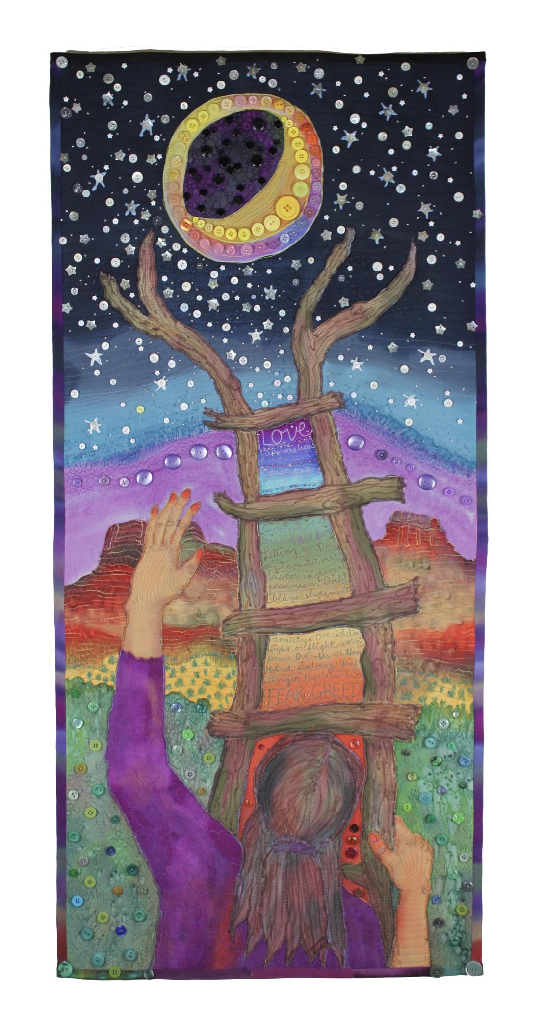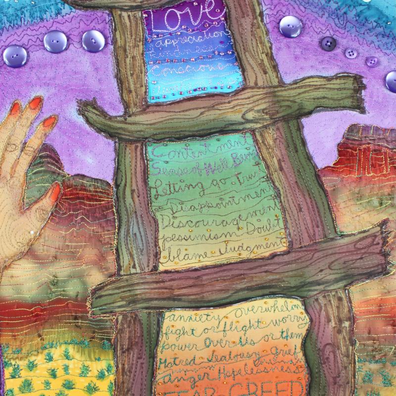 This hand-painted silk quilt depicts us, as Humanity, moving up the Emotional Scale, depicted as a ladder, from hate and fear at the bottom, moving toward Love and Appreciation at the top. I believe this is our journey on the planet at this time, and it is a long, complex, and circuitous one. May more of us be on it!